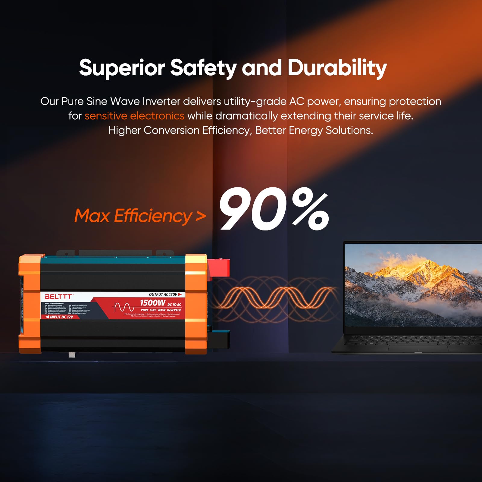 【POWERFUL DC to AC CONVERTER】: This solar inverter delivers 1500W of continuous battery DC 12V to AC 110V 120V power and up to 3000W of peak surge power when the load is started. The 12V inverter has a conversion efficiency of greater than 90% during normal working and low no-load losses