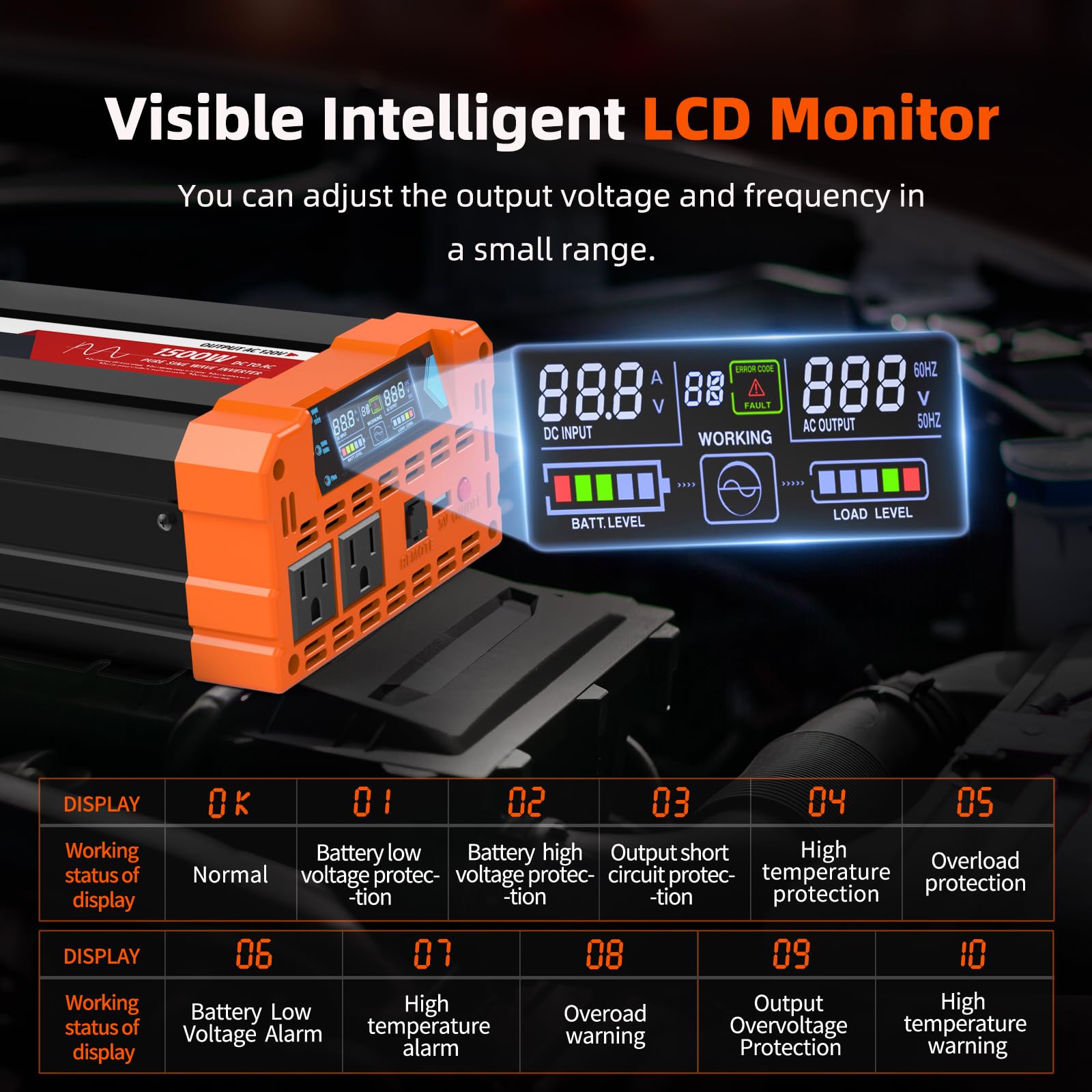 【INTELLIGENT LCD DISPLAY】: This 1500Watt inverter comes with a high-brightness real-time smart screen that simultaneously displays input and output voltages, battery and load status, multiple operating conditions for timely troubleshooting. At the same time, the output voltage and screen can be adjusted independently in a small range