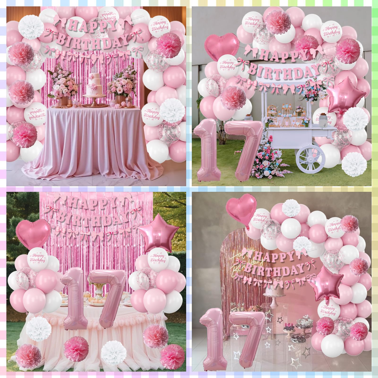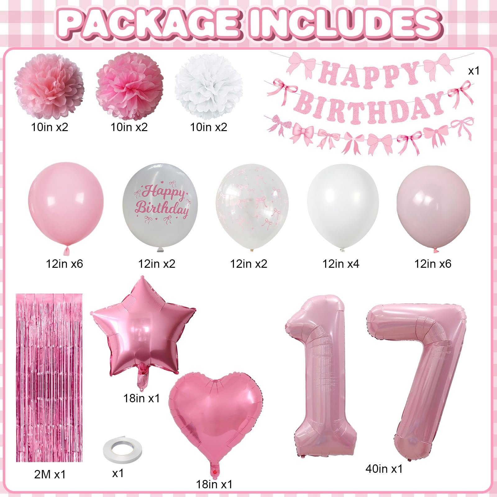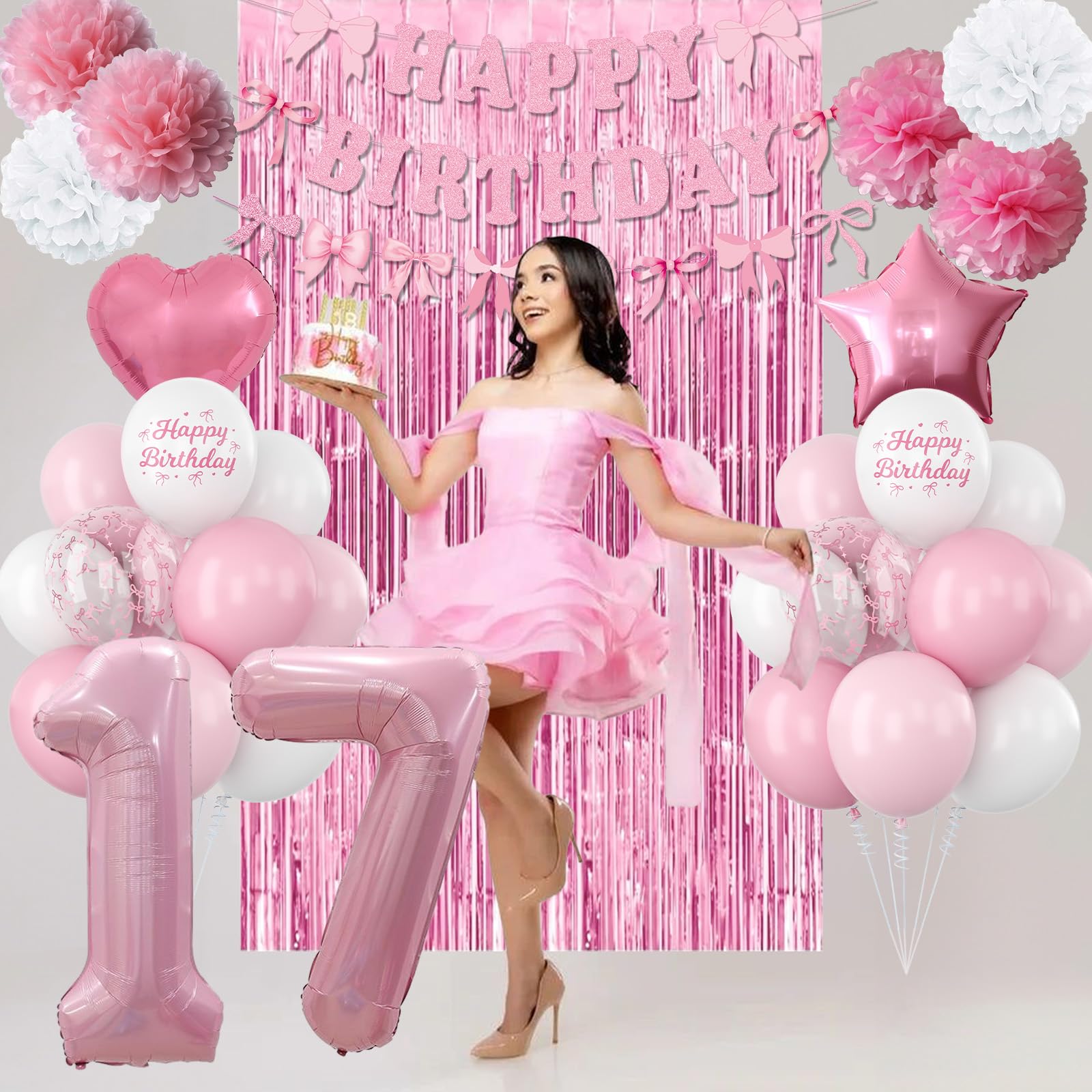PACKAGE INCLUDES: 1pc pearl pink number 17 balloon, 1pc bow happy birthday banner, 2pcs pink paper pom poms, 2pcs light pink paper pom poms, 2pcs white paper pom poms, 1pc pink curtain, 1pc light pink star foil balloons, 1pc light pink heart foil balloons,6pcs light pink balloons, 6pcs pastel pink balloons, 4pcs white balloons, 2pcs birthday printed balloons, 2pcs bow clear balloons, 1pc ribbon
