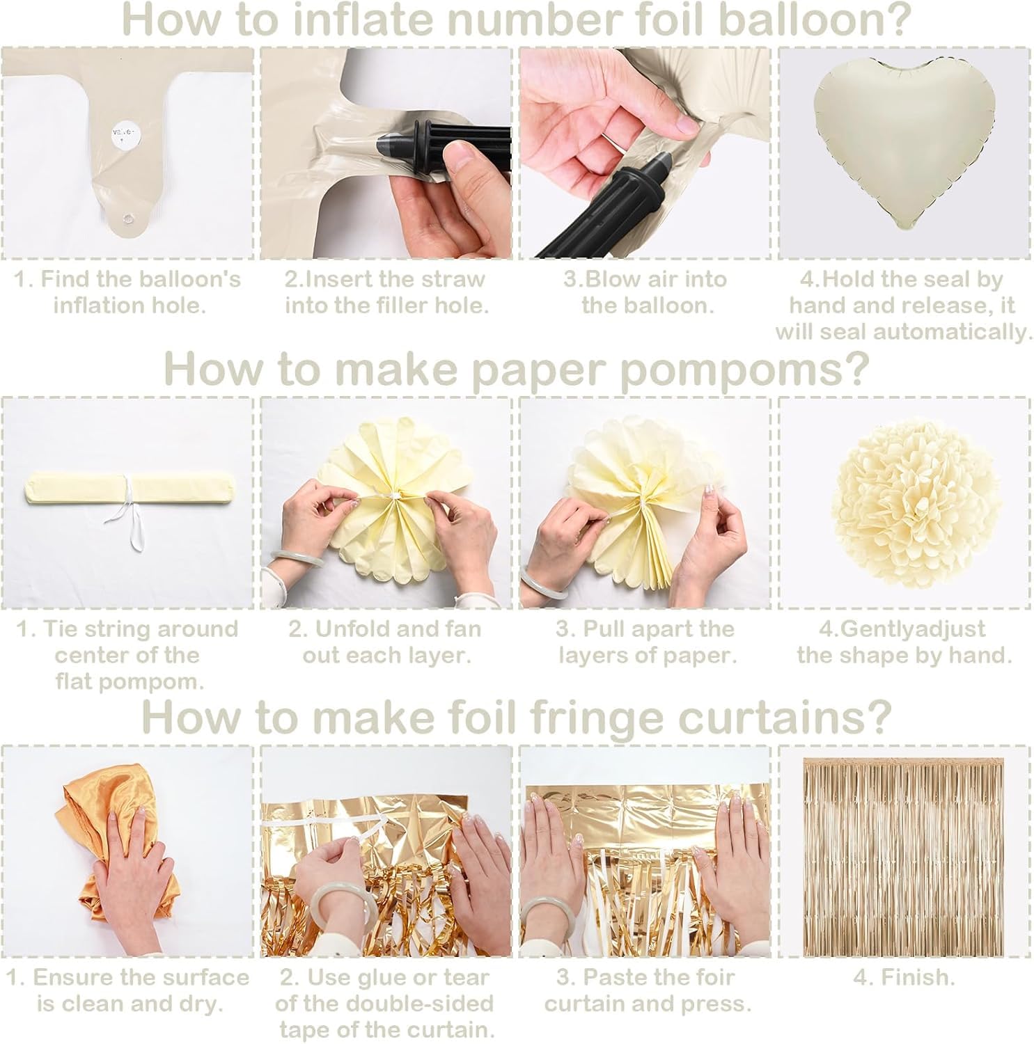 WARM TIPS: Balloons may appear slightly different in color before inflation; paper flowers come folded for protection during transit, gently unfold and fluff them up to achieve a full and beautiful look; adult supervision is recommended when decorating, especially around children and balloons