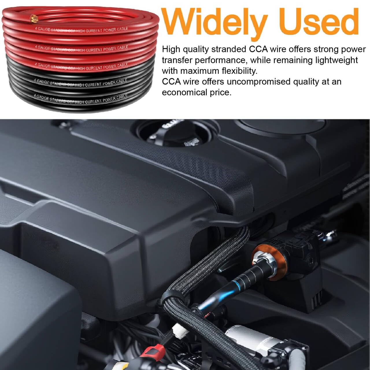 4 Gauge CCA Cable,Flexible PVC Jacket,Loads of 100A,Length:Red &Black each 25ft.