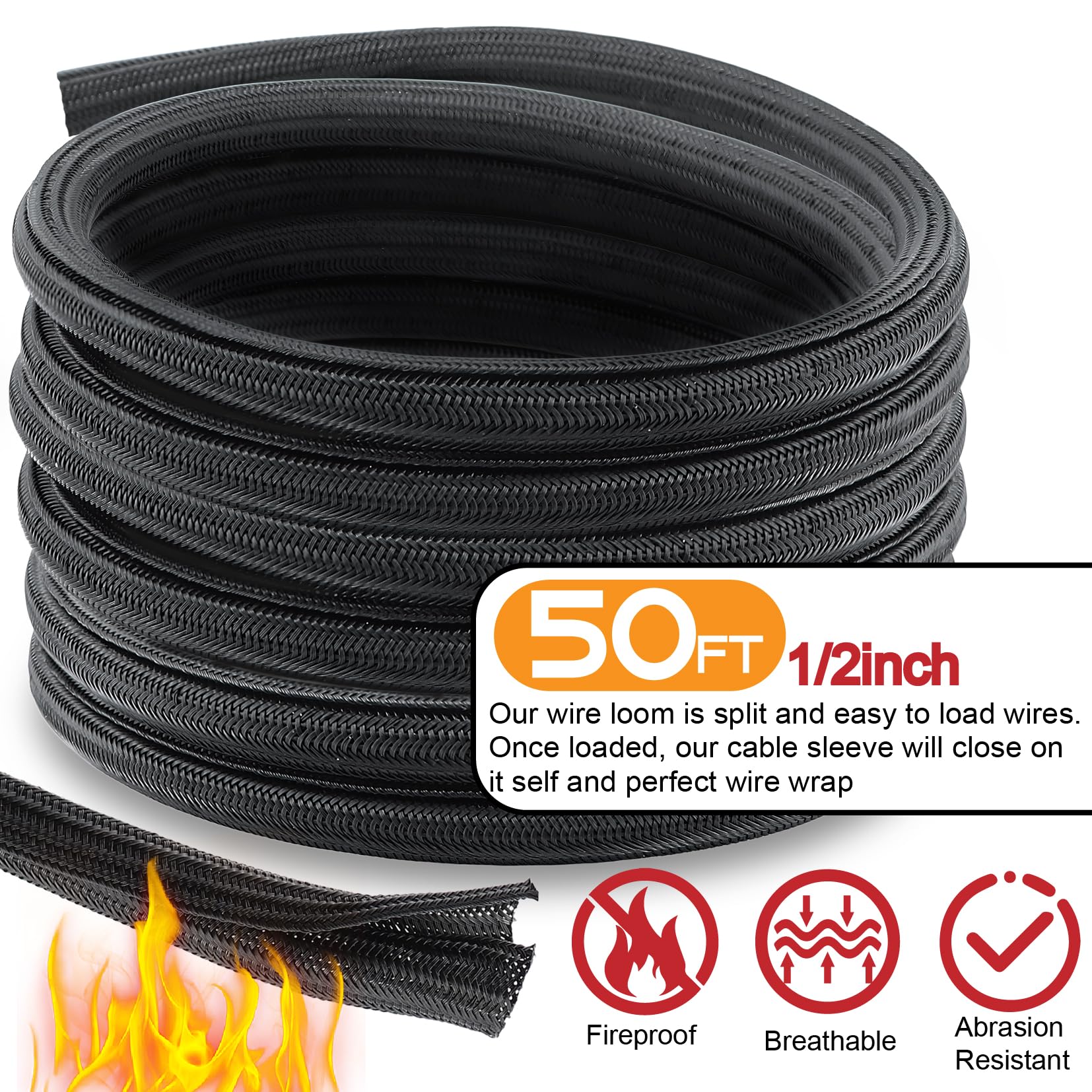 50Ft 1/2 inch PET Cable Sleeve,Once loaded,the cable sleeve will close on itself and perfect wire.