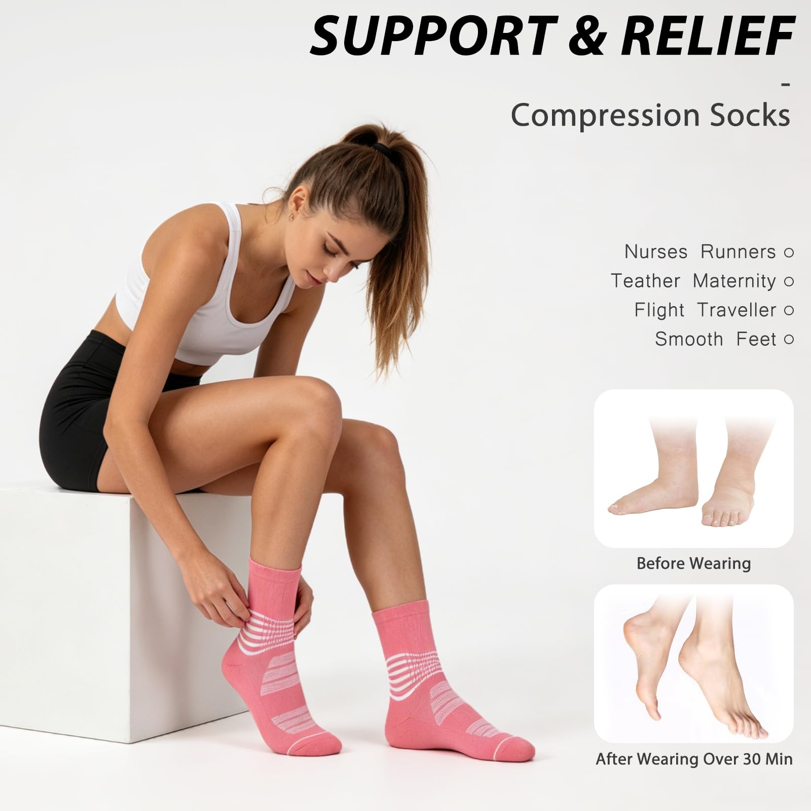 Enhanced Blood Circulation : The compression socks to enhance blood circulation help minimises swelling of the calves and feet during travel, pregnancy, long shifts, or intense exercise, offering effective swelling relief.Whether as a compression running socks or a post surgery compression socks it does the job well!