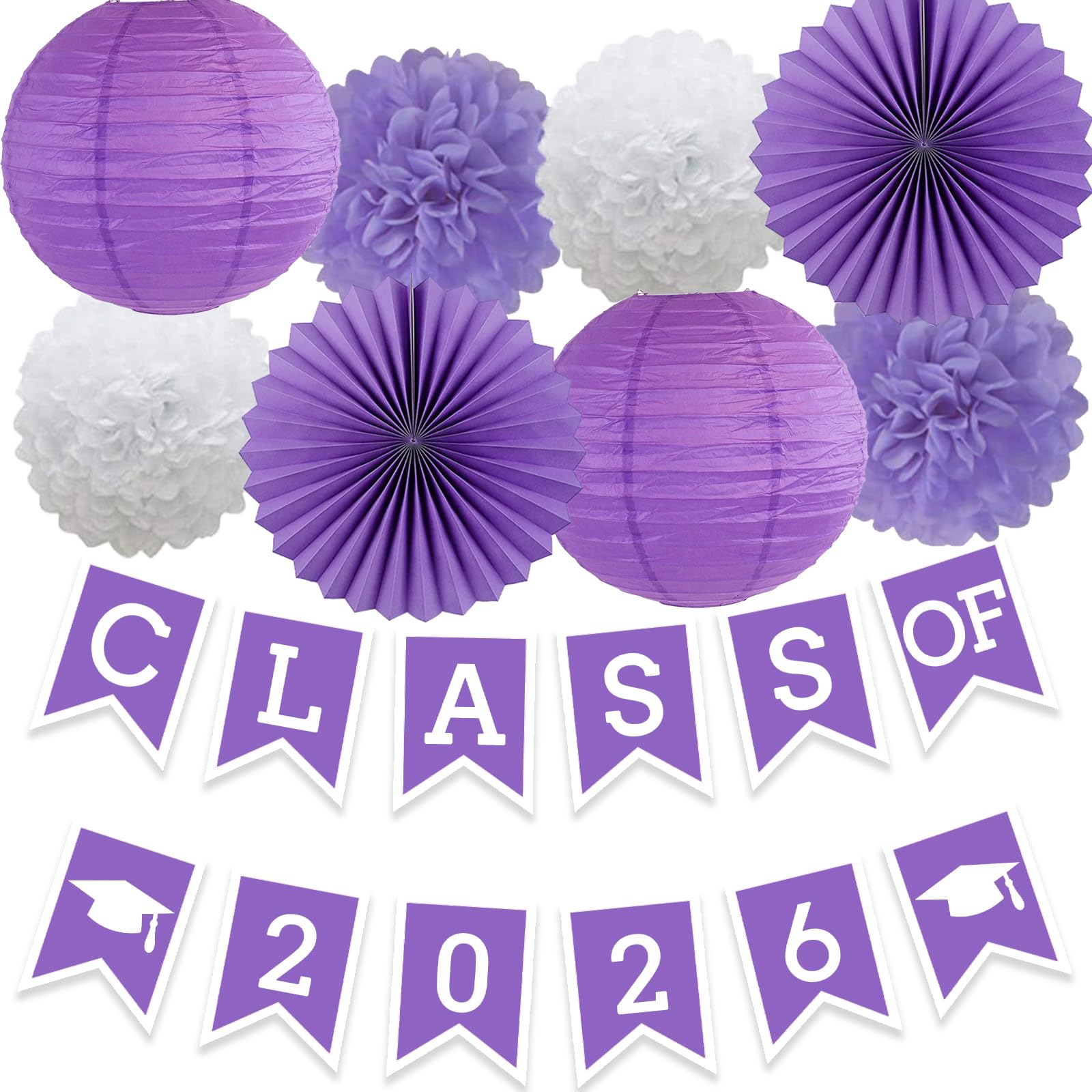 Quantity: 1 purple class of 2026 banner with 2 white grad caps, 2 purple pom poms flowers, 2 white pom poms flowers, 2 purple paper lanterns, 2 purple paper fan flowers