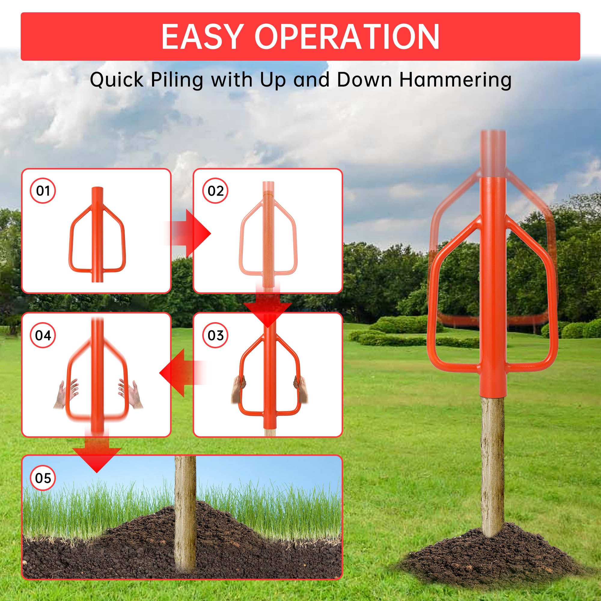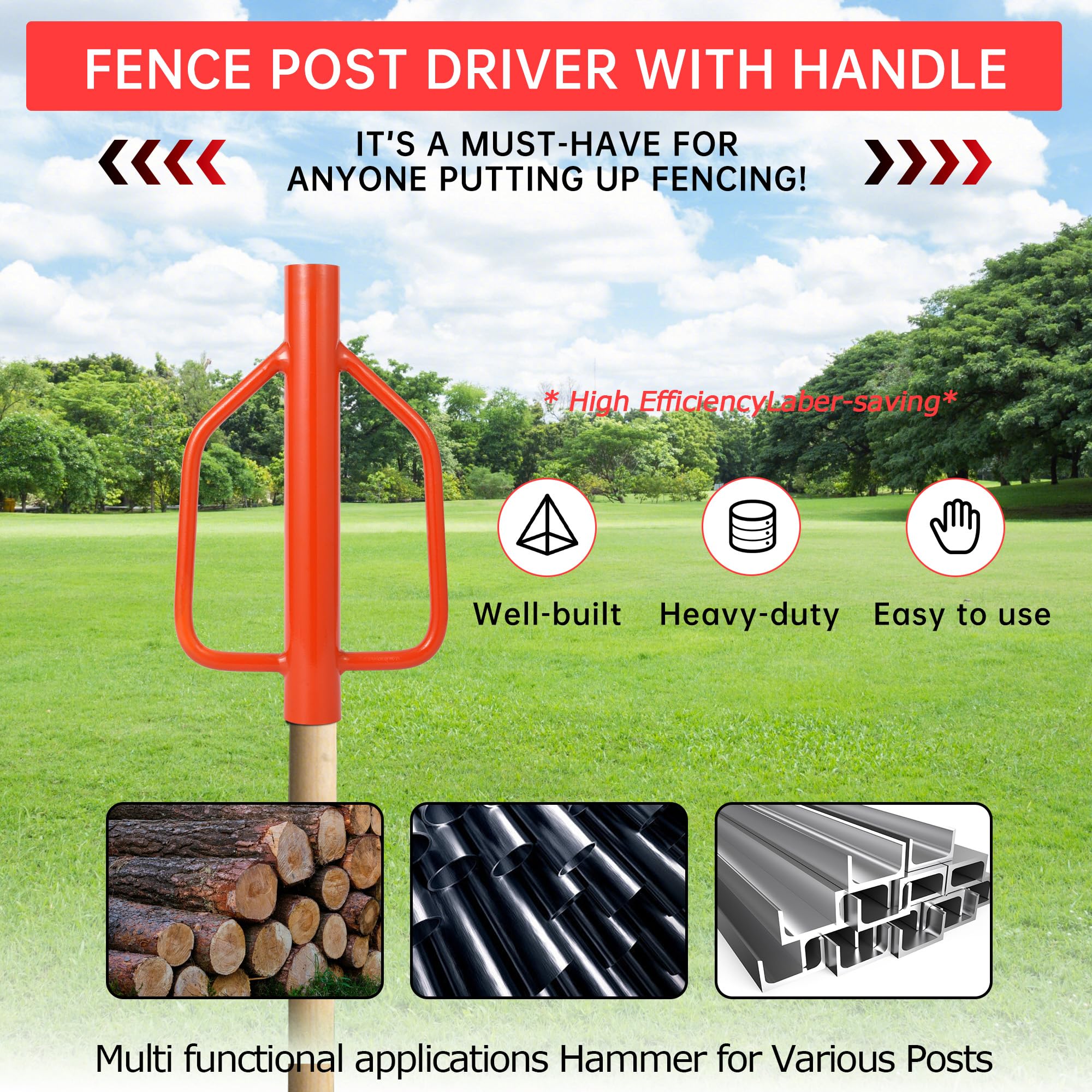 ✔ FIVE OPTIONS:We offer five type post pounder options:① 30LB post driver ② 37LB t-post driver ③ 18LB post pounder ④ 12LB post pounder driver⑤ 8LB fence post hammer; it easily sinks fence posts in red clay. Solid, weighty, and should last forever. Much easier and less strenuous than the hand sledge.