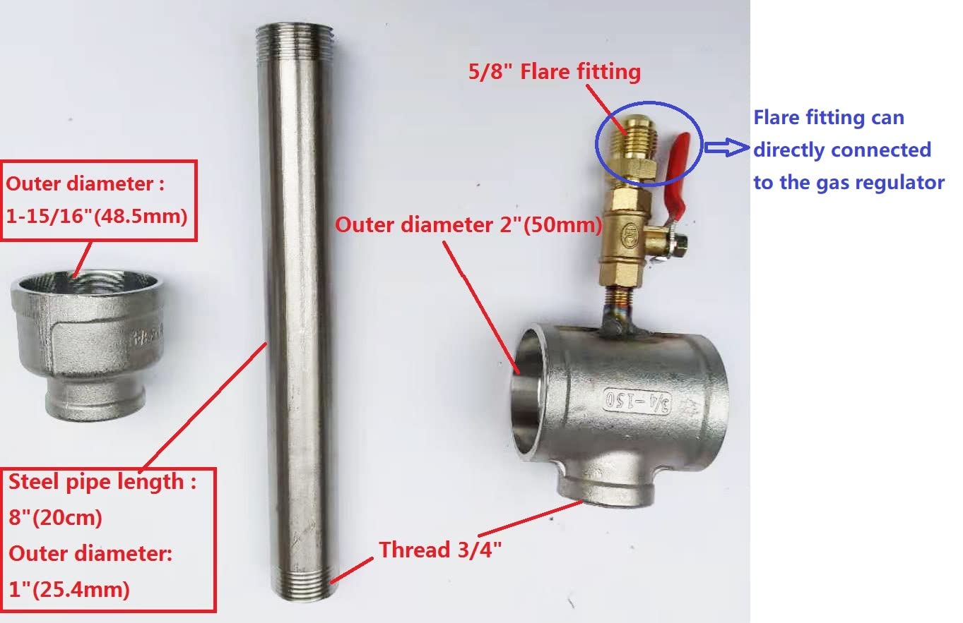 【Cost-saving & Self-adjusting】 We use 1" O.D. feed tube ( 8''=20cm long) and 2" O.D. air choke allow for maximum air flow with a proper size gas port tuned to produce higher BTU with less propane , this design is more efficient and saves you money on propane cost , and can run at lower gas pressure and produces a NEUTRAL flame with no need to adjust air flow , the burner is self-adjusting and drafts the proper amount of air based on fuel pressure.