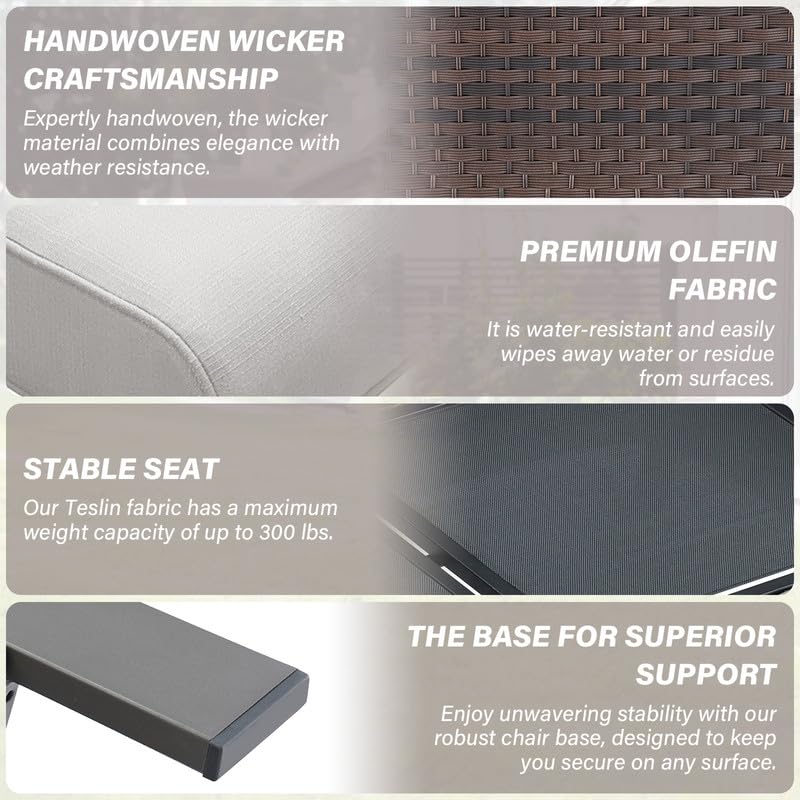 Built to Last:Crafted with a corrosion-resistant, powder-coated steel frame, Belord outdoor wicker furniture set chairs are built to last with a weight capacity of up to 300 lbs. The hand-woven PE wicker is not only durable and weather-resistant but also lightweight, making it perfect for year-round outdoor use.