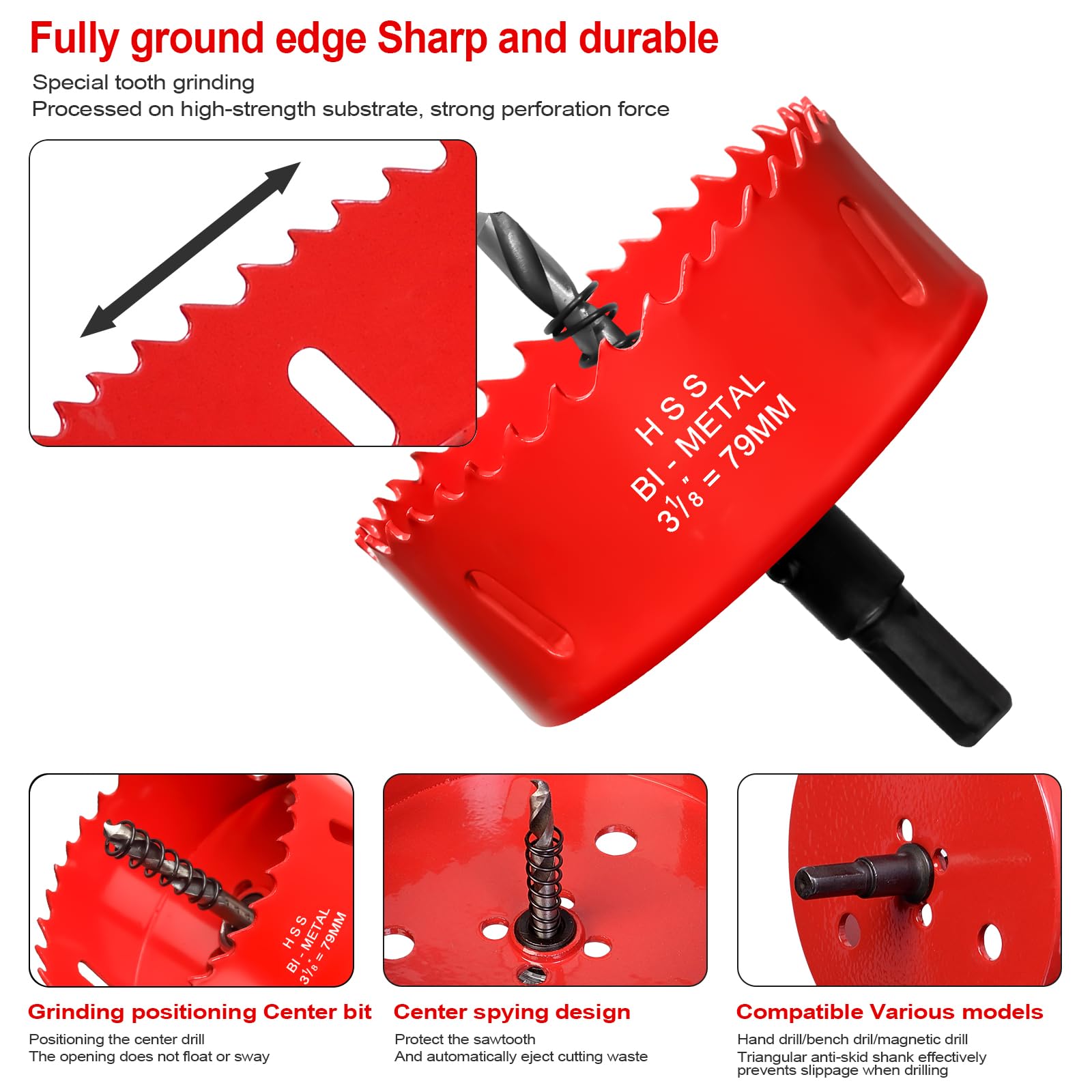 ITOOLFIRM HOLE SAWS for cutting Wood, Ceiling, Vent Pipes and Drywall Features: BI-Metal + High Speed Steel(HSS) Extremely fast sawing with minimal expenditure of force High concentric and side-stroke precision APPLIED TO CUT... Household wood Plywood Galvanized pipe Fire hose Gypsum board PVC boards Holes in Ceiling for lights Holes for vent or fans Holes in table or wall for cable COMPATIBLE DEVICEs Impact Driver Hand Drill Press Bench Drill Press Cordless Drill Precondition: drill chuck is required COMPATIBLE MATERIAL Wood Plastic Fiberglass Aluminum Copper INSTRUCTIONS Pre-drill using light contact pressure. Continue drilling with minimal, even pressure. Avoid oscillating while drilling. Allow hole saw to “air” when using with wood and wood alternatives. The saw comes to a complete stop on your material before pulling it away. DIFFERENCE: Due to manual measurement and production batch is not the same, the size, weight, color will get difference (within 1%) of the normal case. Miss Parts Problem: Each hole saw is coming with a drill bit and shank, if you have revceived a product from our store without the parts, please return or replace your order.