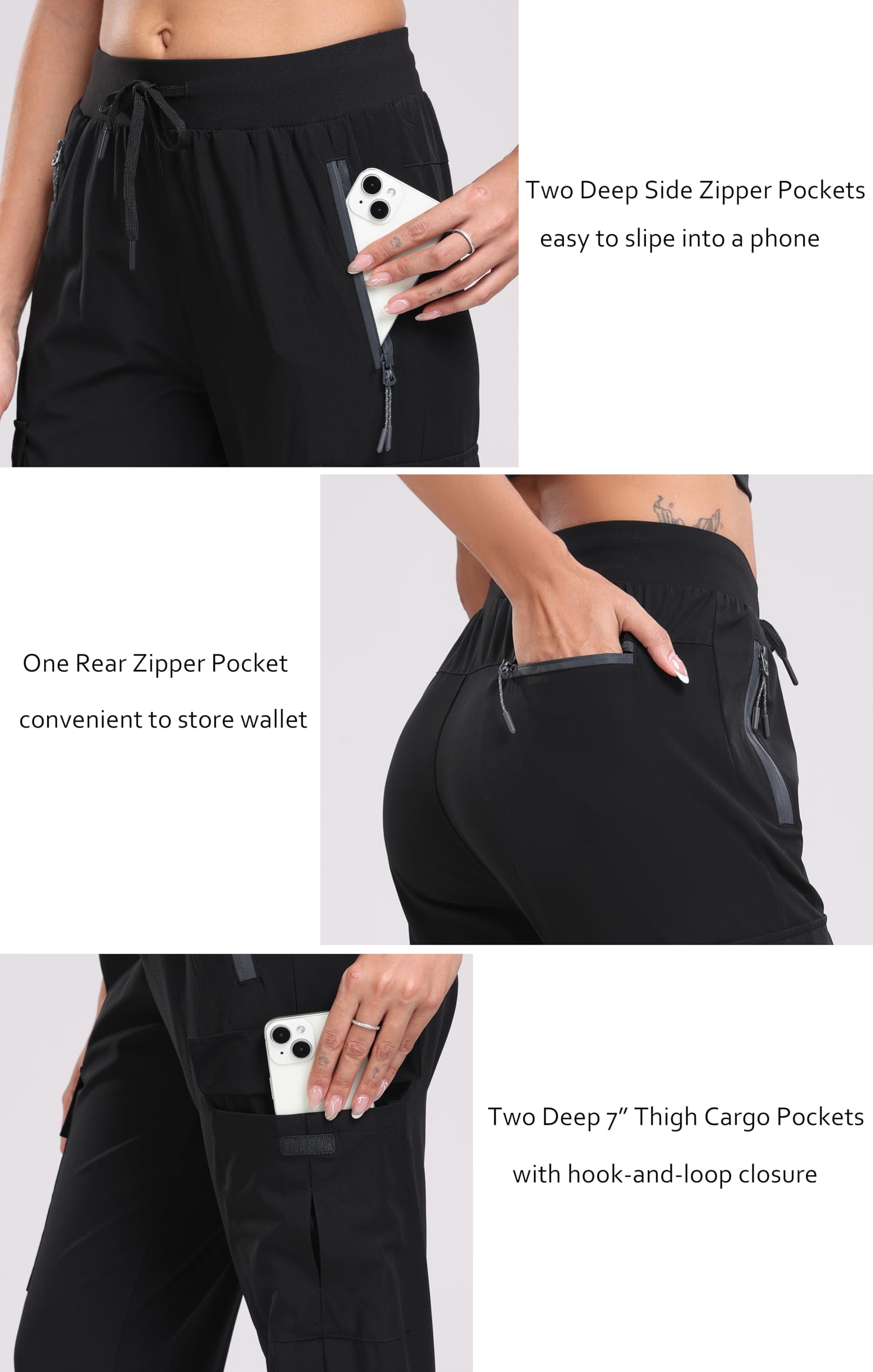 Multiple deep pockets--cargo joggers have 5 pockets include 2 large front hand zip pockets, 2 thigh cargo pockets about 7" deep with hook-and-loop closure, 1 roomy rear zipper pocket.Easily carry a phone, headphone case, passport, tools or more essentials in the pockets.Keep your hands free on a hike, travel, even work in the garden.