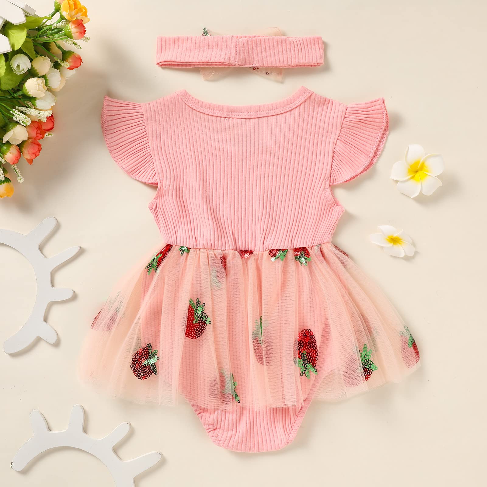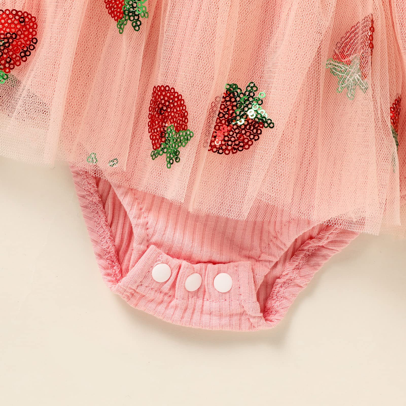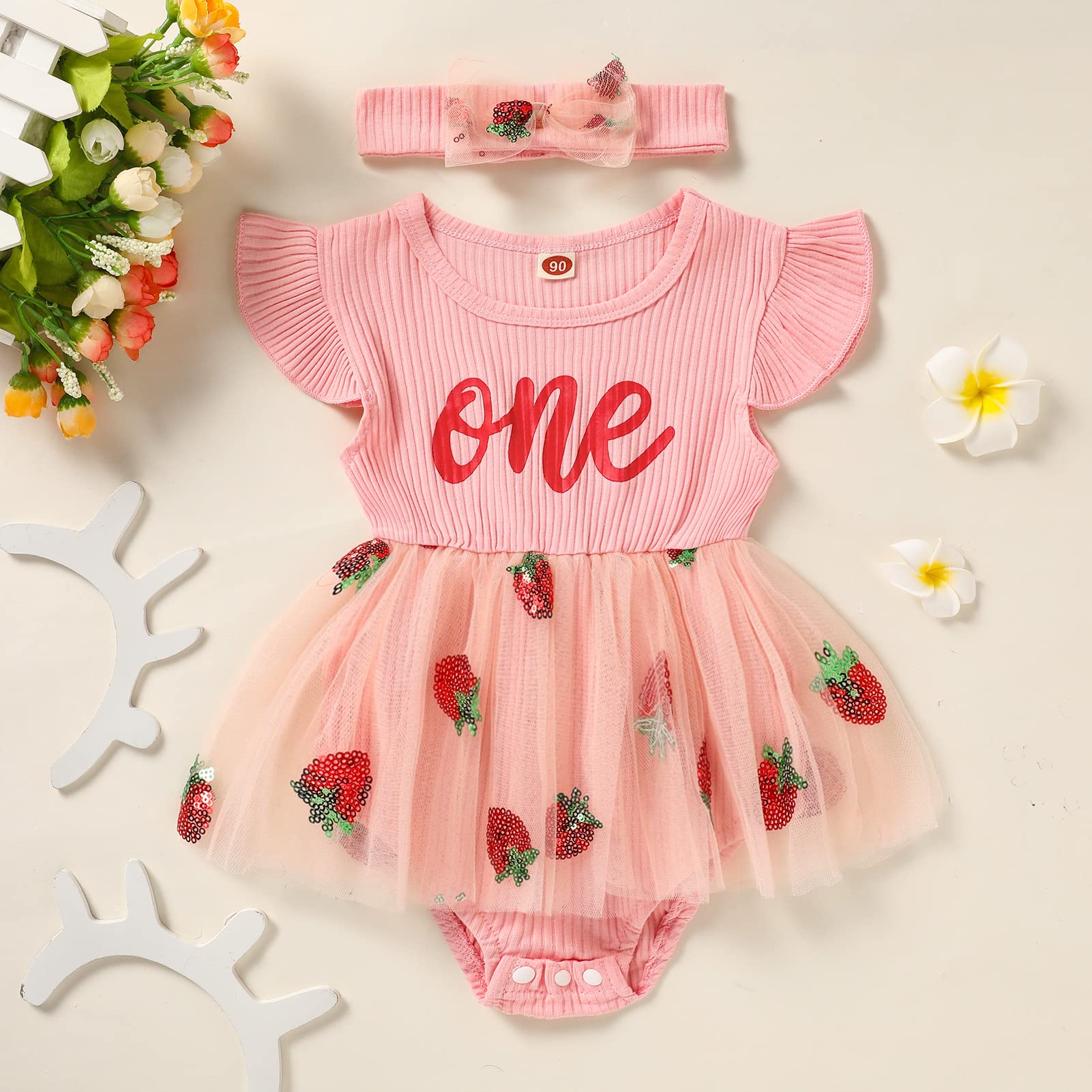 🎀 1ST BIRTHDAY ROMPER - "One" letters and lovely strawberry / butterfly / donuts print romper, three snaps for easily diaper changing, candy colors cake smash outfits, ruffle ribbed tulle one-piece clothes for your little girl's first birthday.