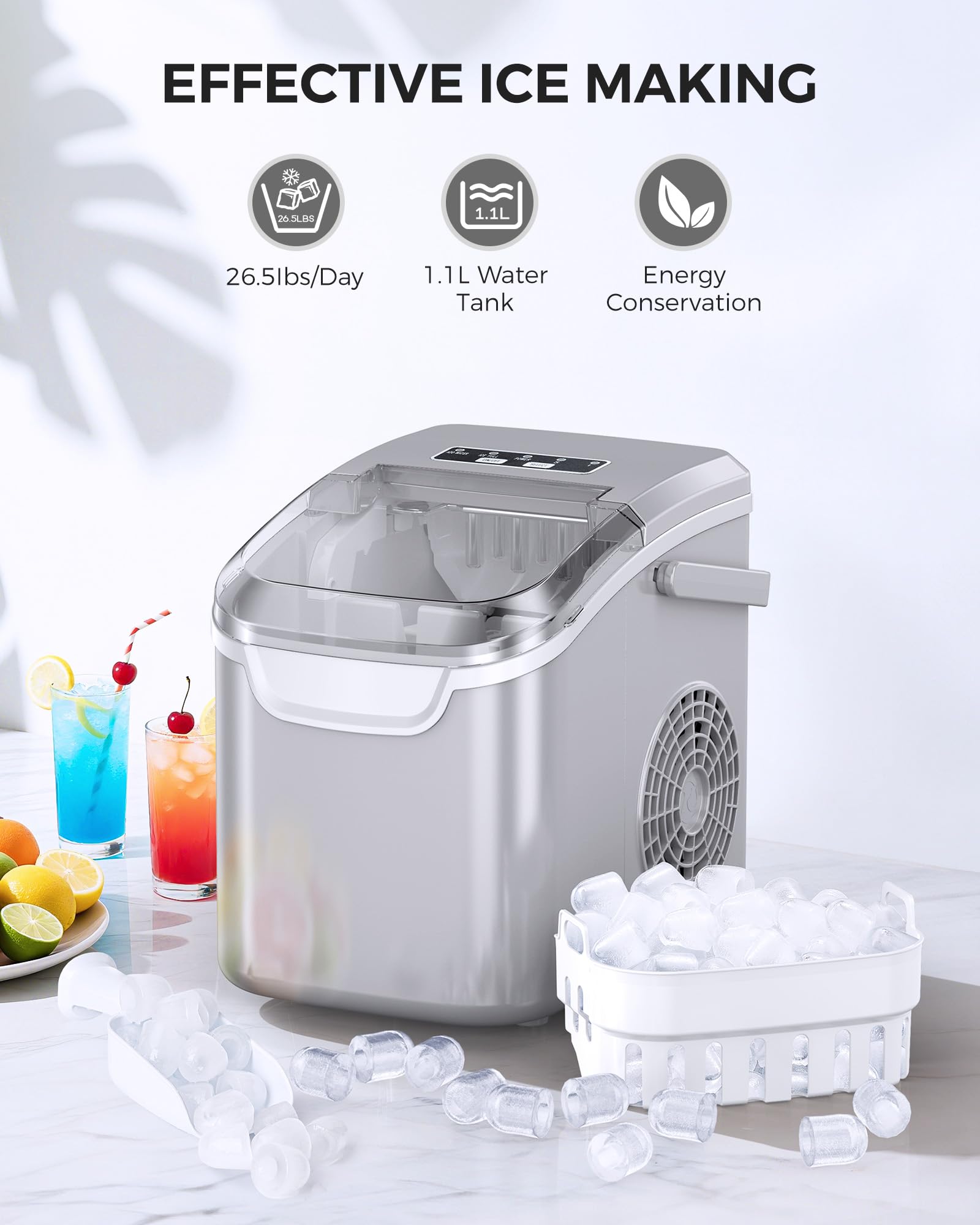 Portable and Space-Saving: This ice maker has a compact design and comes with a handle, making it easy to carry. The ice maker weight is 11.75 pounds.