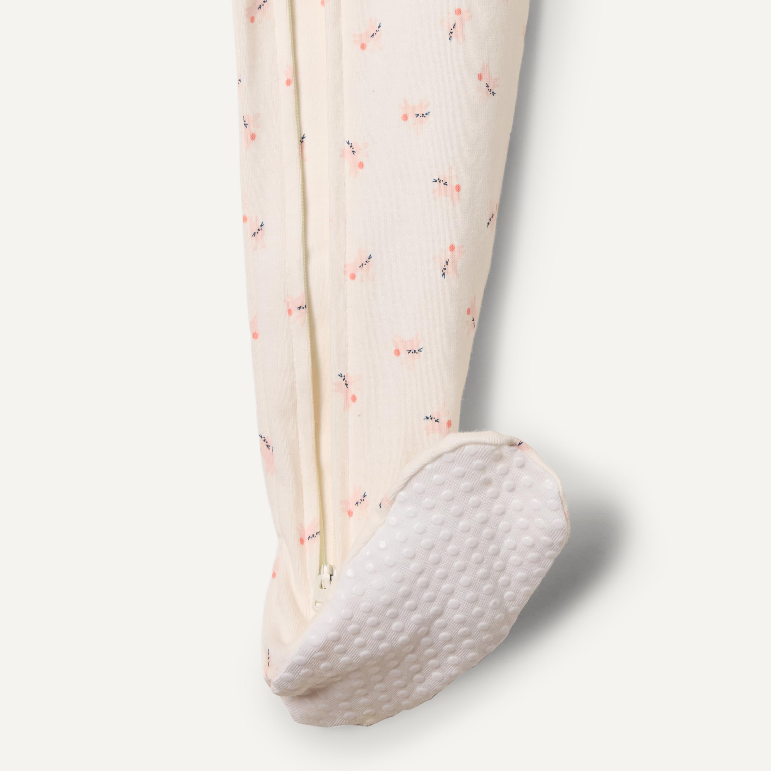 DETAILS: Ribbed cuffs and neck, full ankle-to-chin one-way zipper and attached feet with anti-slip dots on the sole. Designed to be a full-length inseam