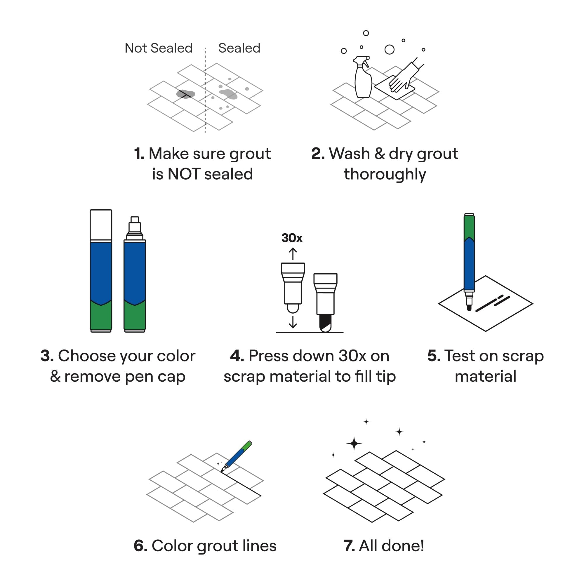 DRY TIP: Pen needs to be primed before use, all new Grout Pens come with a dry white tip. To activate gently pump the tip (20-30 times) until fully saturated