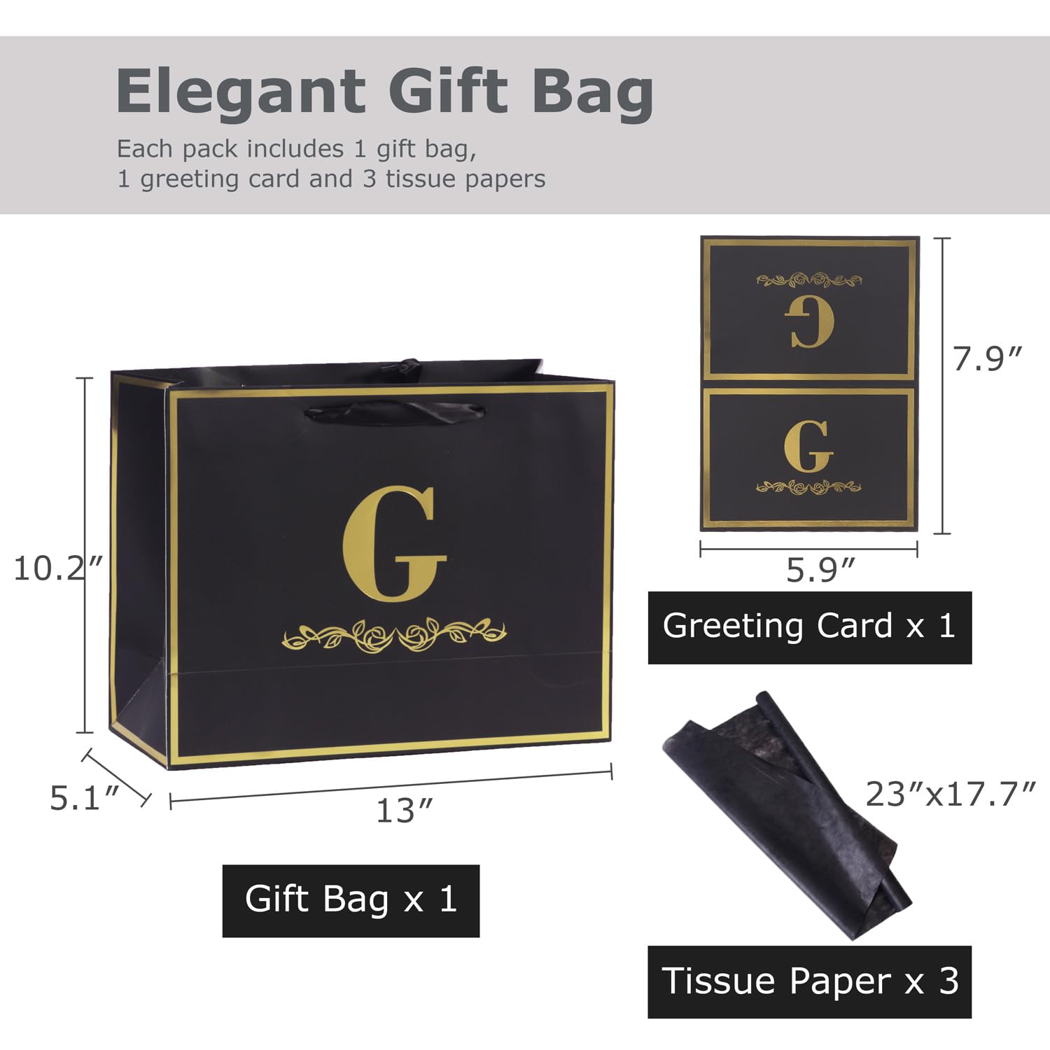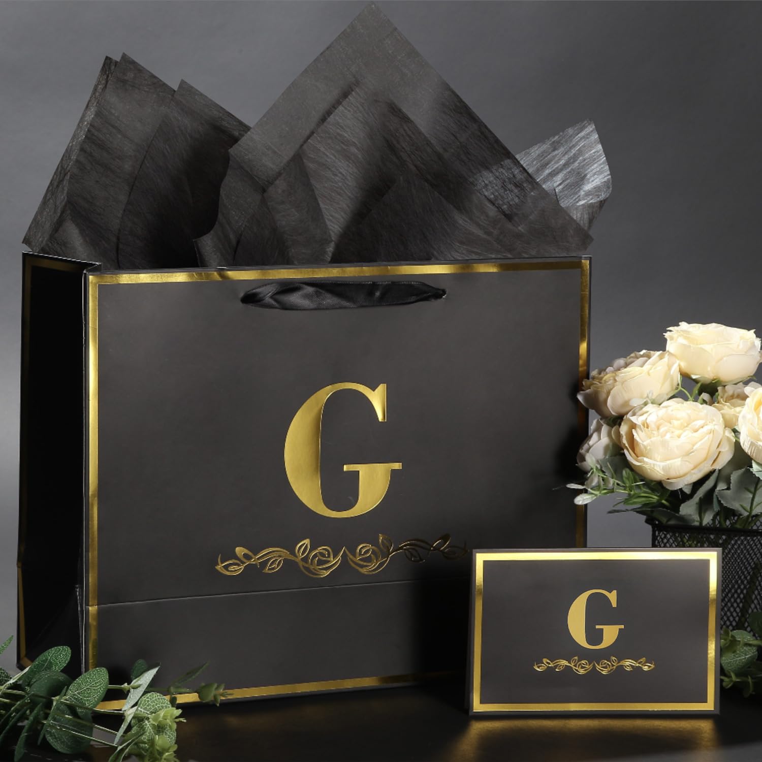 Alphabet Birthday Gift Bag with Card and Tissue Paper for Men Women, 13" Large Black Gold Personalized Horizontal Paper Bag for Gifts Wrapping - (Letter G)