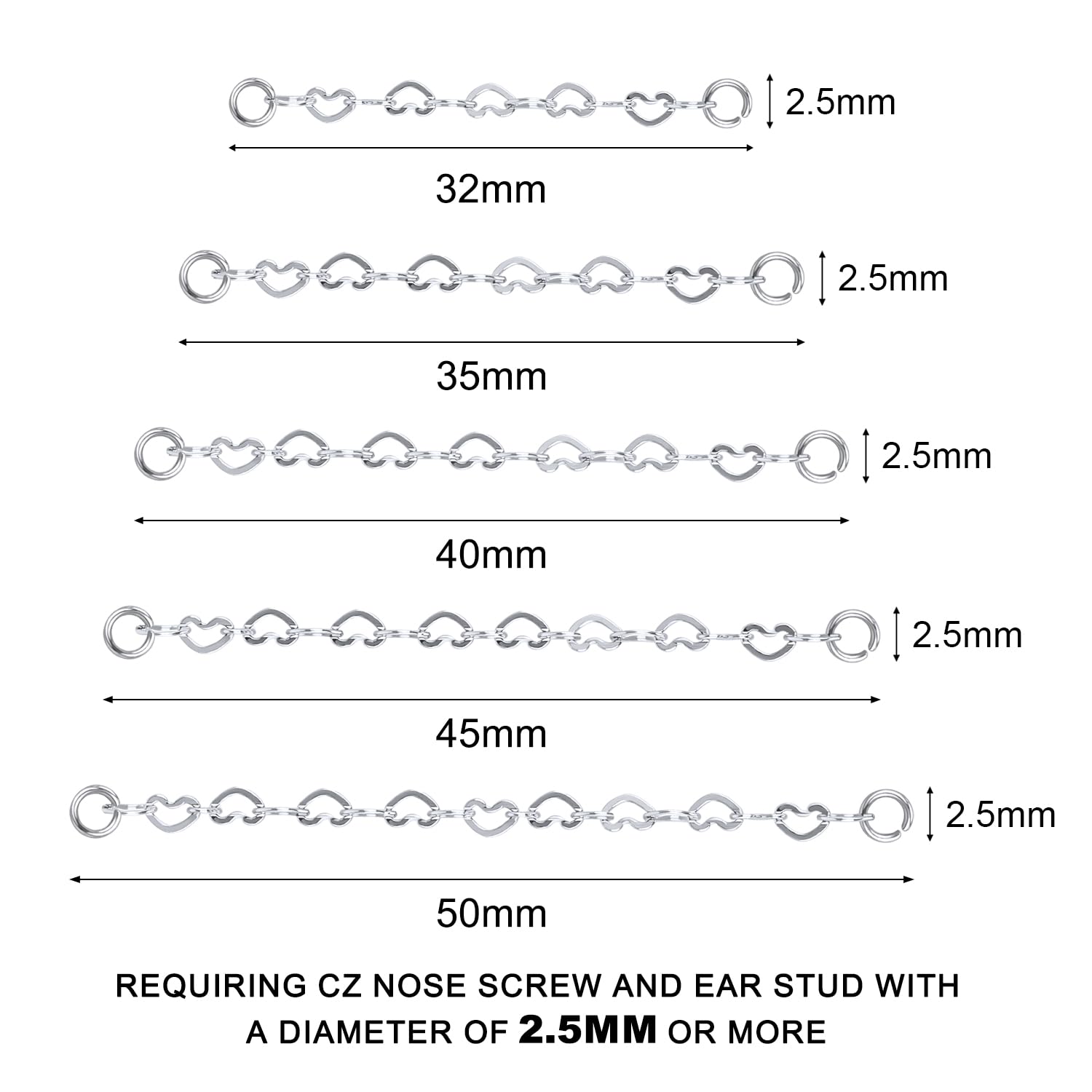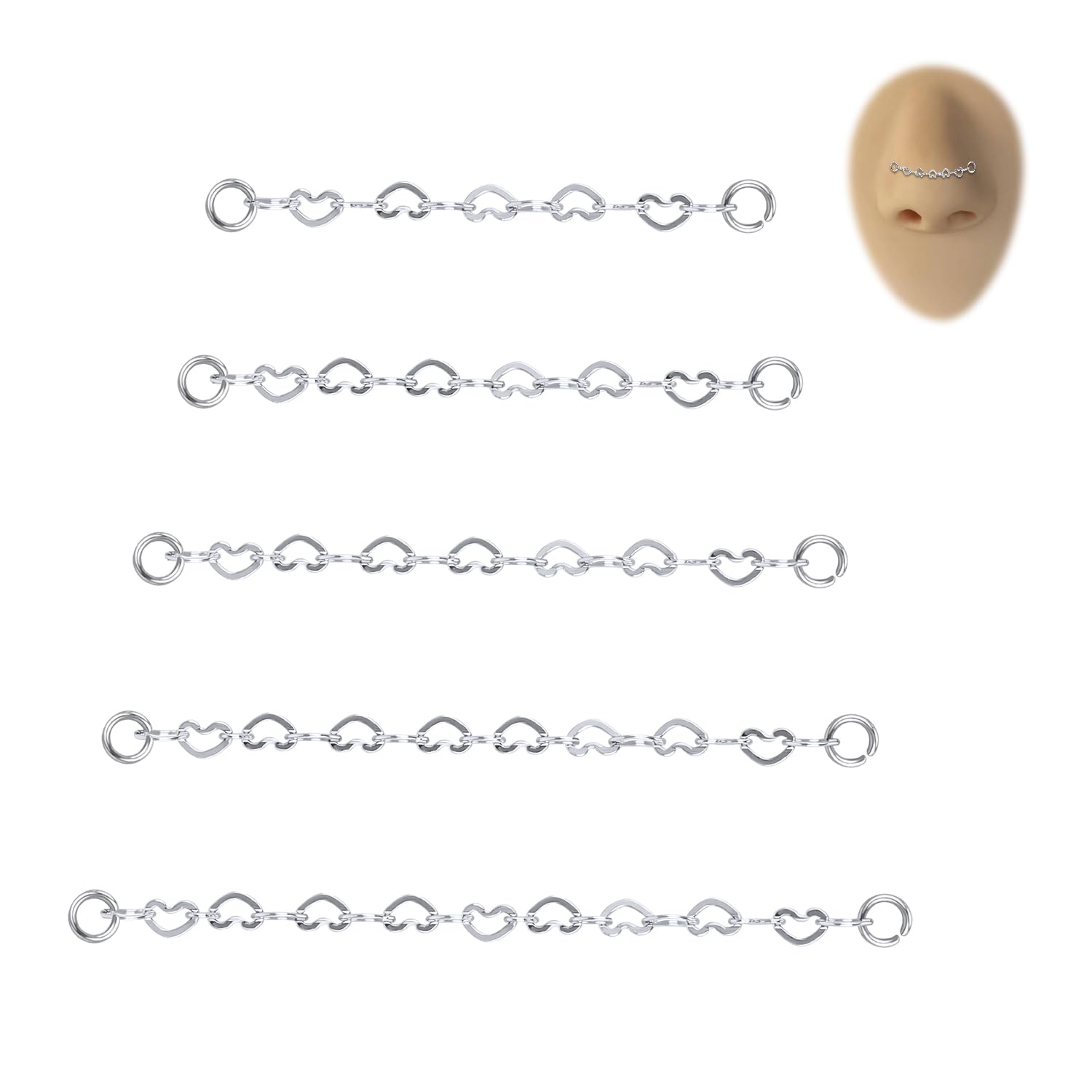 ★Packaging & Size: Five different sizes of nose ring chains, 32mm, 35mm, 40mm, 45mm, 50mm, meet your wearing needs for different parts. The position of the nose chain buckle requires CZ nose nails and ear nails with a diameter of 2.5mm or more. (This set does not include nose studs, nose rings, or earrings)