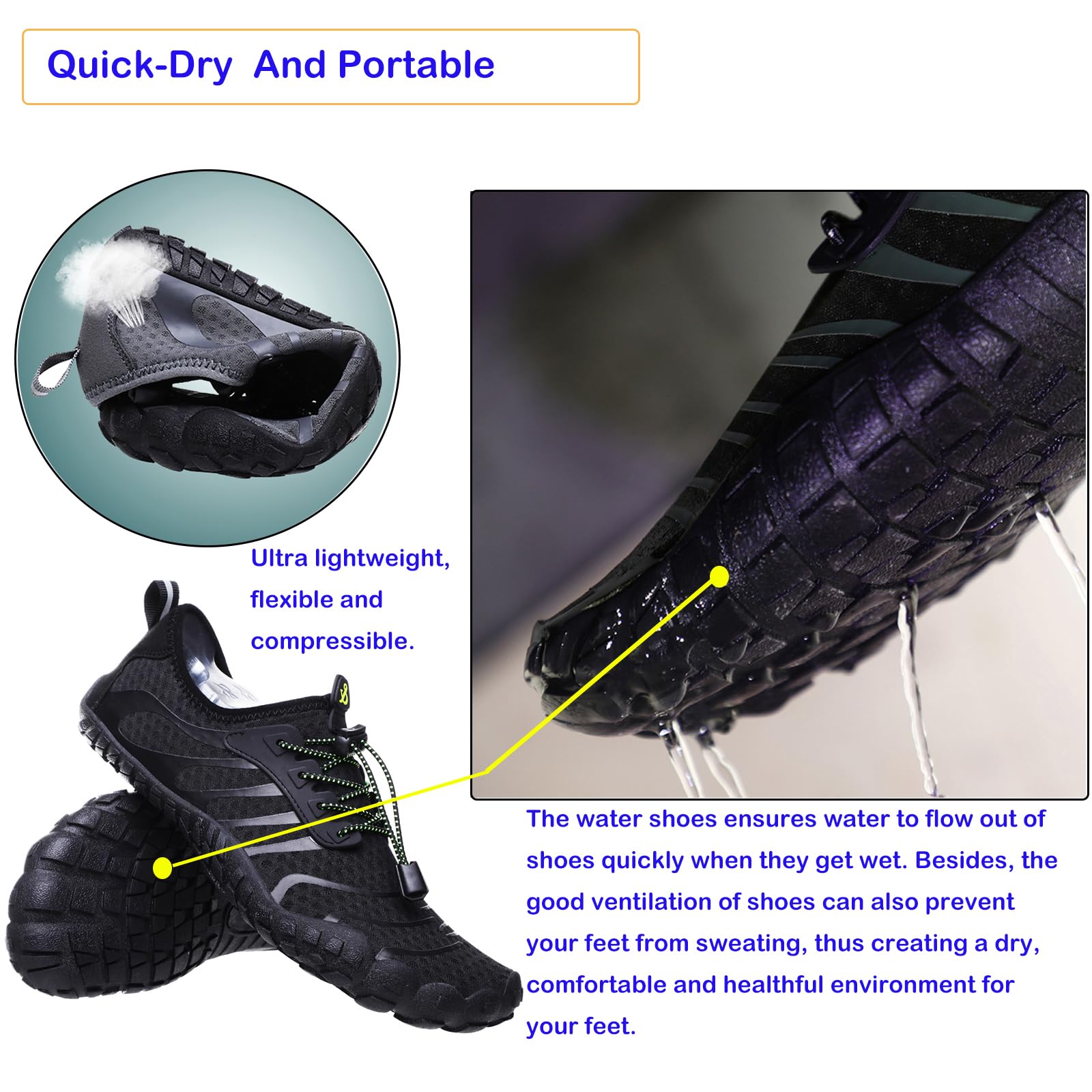 【Quick-Dry】water shoes for men ensures water to flow out of shoes quickly when they get wet. Besides, the good ventilation of shoes can also prevent your feet from sweating, thus creating a dry, comfortable and healthful environment for your feet. and guarantee the breathable and quick-dry experience.