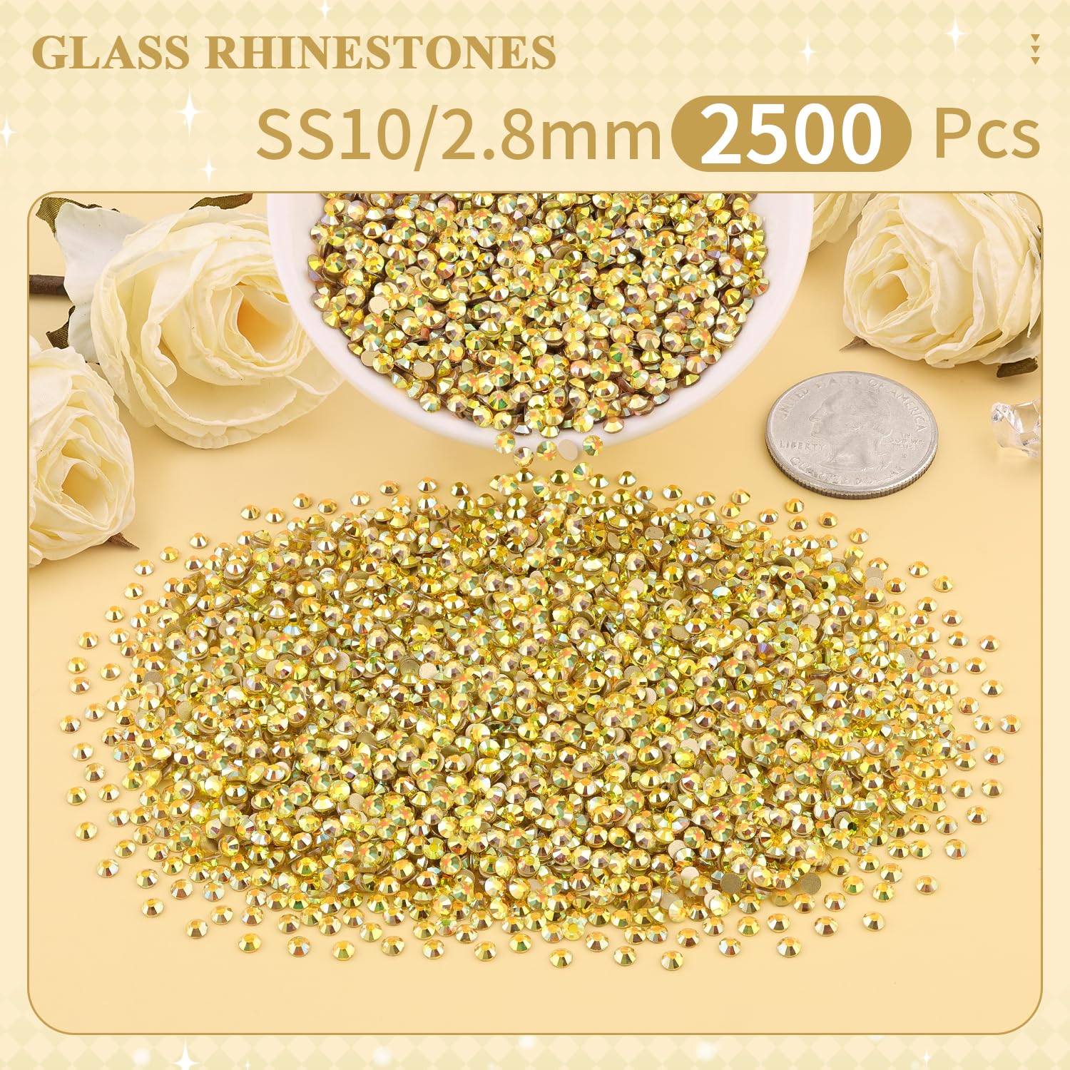 WHAT WILL YOU GET -- The package contains about 2500 pcs SS10 (0.11") blingbling glass rhinestones (Metal Sunlight). The large amount will support you to fulfill a number of wonderful DIY decoration ideas.