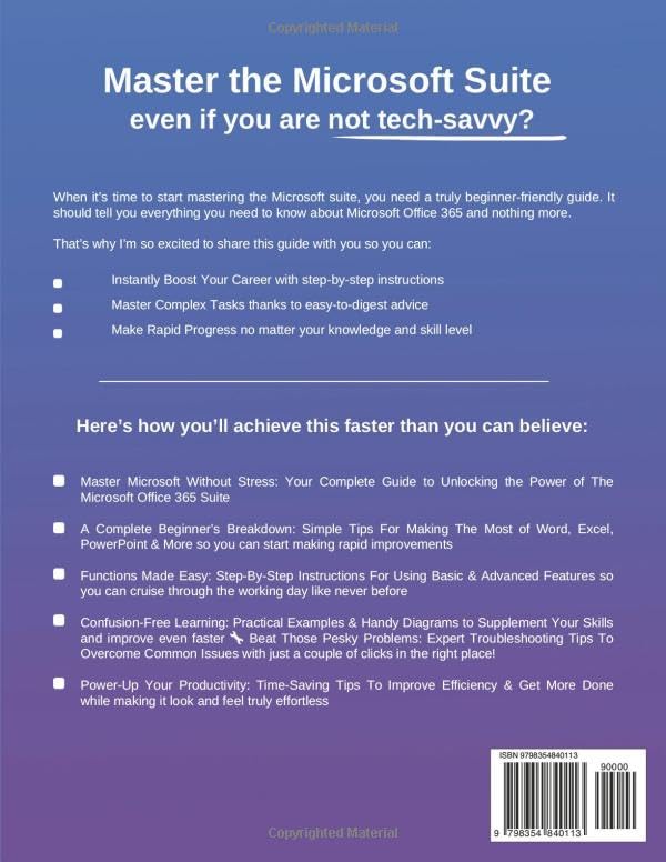 🌟 How Can YOU Master the Microsoft Suite even if you are not tech-savvy? 🚀 What would your working day look like if you could go from battling your PC to using it as a powerful new tool? 🎉 You’ve landed on the right page, my friend… When it’s time to start mastering the Microsoft suite, you need a truly beginner-friendly guide. It should tell you everything you need to know about Microsoft Office 365 and nothing more. That’s why I’m so excited to share this guide with you so you can: Instantly Boost Your Career with step-by-step instructions Master Complex Tasks thanks to easy-to-digest advice Make Rapid Progress no matter your knowledge and skill level Here’s how you’ll achieve this faster than you can believe: 📘 Master Microsoft Without Stress: Your Complete Guide to Unlocking the Power of The Microsoft Office 365 Suite 📗 A Complete Beginner’s Breakdown: Simple Tips For Making The Most of Word, Excel, PowerPoint & More so you can start making rapid improvements 📙 Functions Made Easy: Step-By-Step Instructions For Using Basic & Advanced Features so you can cruise through the working day like never before 📕 Confusion-Free Learning: Practical Examples & Handy Diagrams to Supplement Your Skills and improve even faster 🔧 Beat Those Pesky Problems: Expert Troubleshooting Tips To Overcome Common Issues with just a couple of clicks in the right place! ⏰ Power-Up Your Productivity: Time-Saving Tips To Improve Efficiency & Get More Done while making it look and feel truly effortless 🔥🔥🔥Plus, I’ll give you all of these FREE BONUSES! ✅ DOWNLOADABLE BONUS INSIDE: Download the best-seller EXCEL 2023 for an advanced guide about the most widely used software in the world!🔥🔥🔥 💥💥Get Your Copy Today! Scroll Back Up and Click the “BUY NOW” Button to Learn Everything you NEED to Master Microsoft Office 365!💥💥