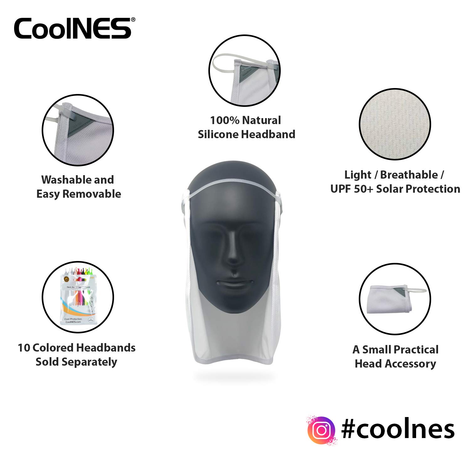 CoolNES Neck Face Shield is composed of a unique Mesh Fabric that offers a Shield System containing the highest UPF Solar Protection, Quick Dry breathing and Chemical-FREE Cooling.