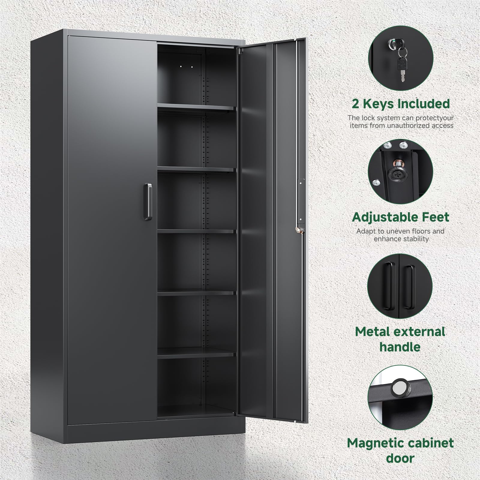Large Storage Space: Steel storage cabinets H72 * W36 * D18 inch , features 5 adjustable shelves, 6 floors in total, shelves can hold up to 180 lbs, which is very suitable for storing office documents supplies, garage tools or other large and heavy household items, ideal for long-term to use. 71-inch counter height perfect for use in homes, offices, garages, schools, shops, warehouses or other commercial spaces