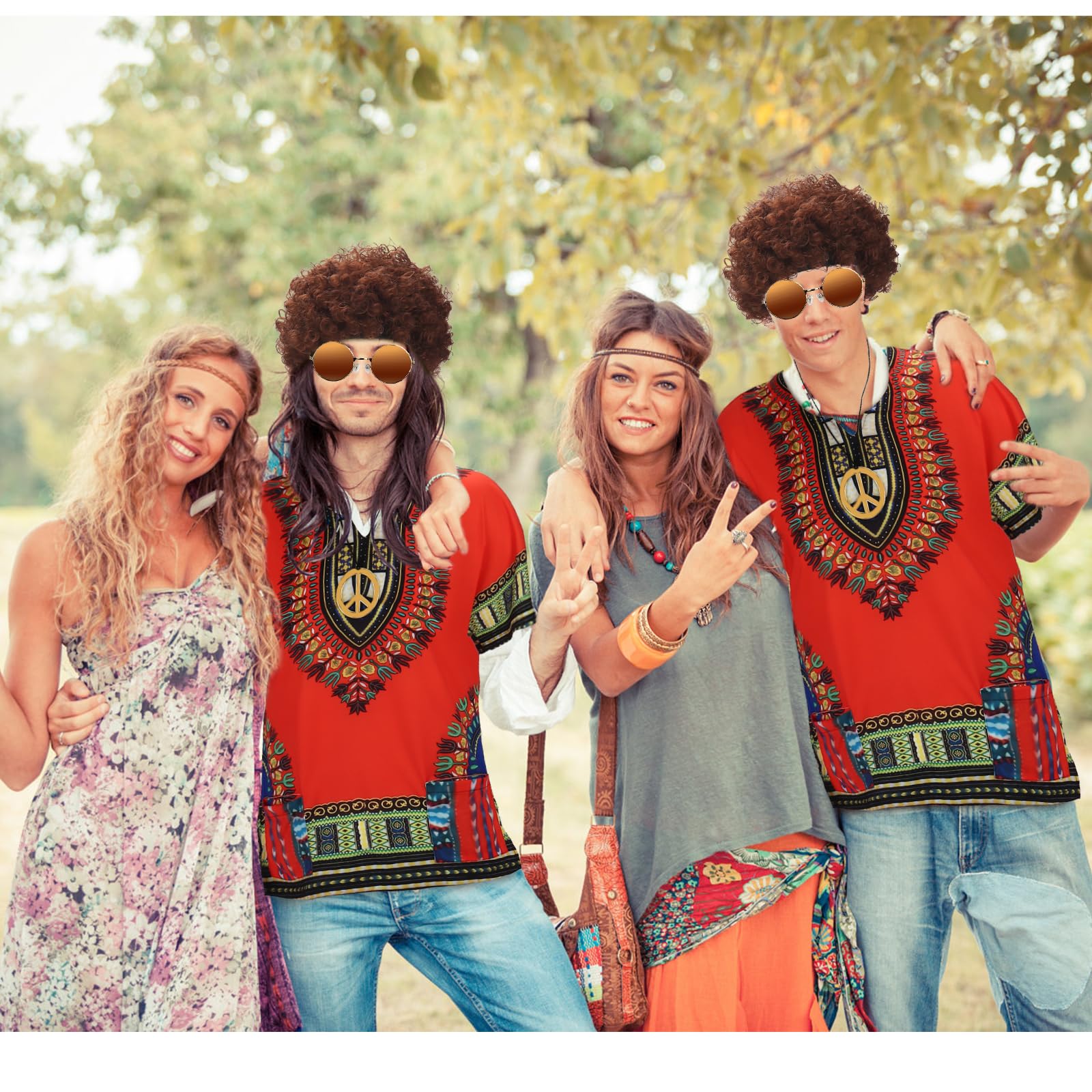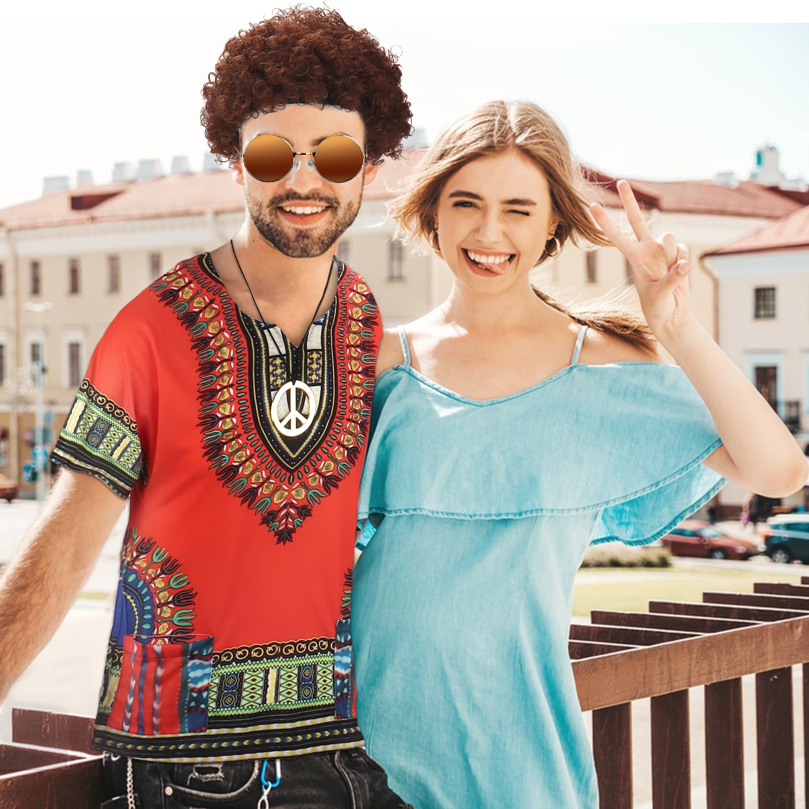 Retro Hippie Outfits: Hippie costume set contains 1 hippie T-shirt, 1 light brown Afro wig, 1 hippie sunglasses and 1 peace sign necklace, energetic 70s hippie accessories can dress you up as a charming man