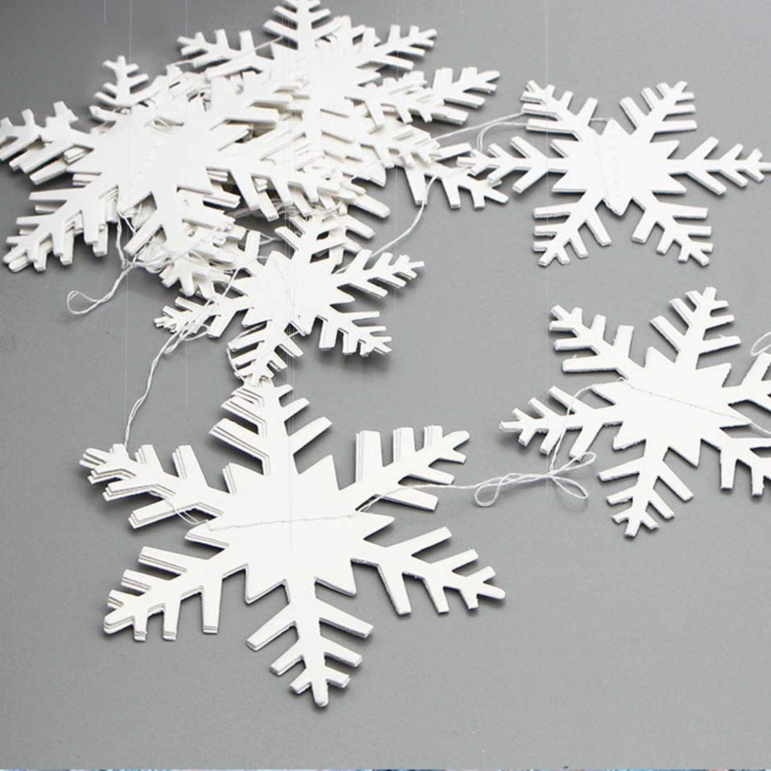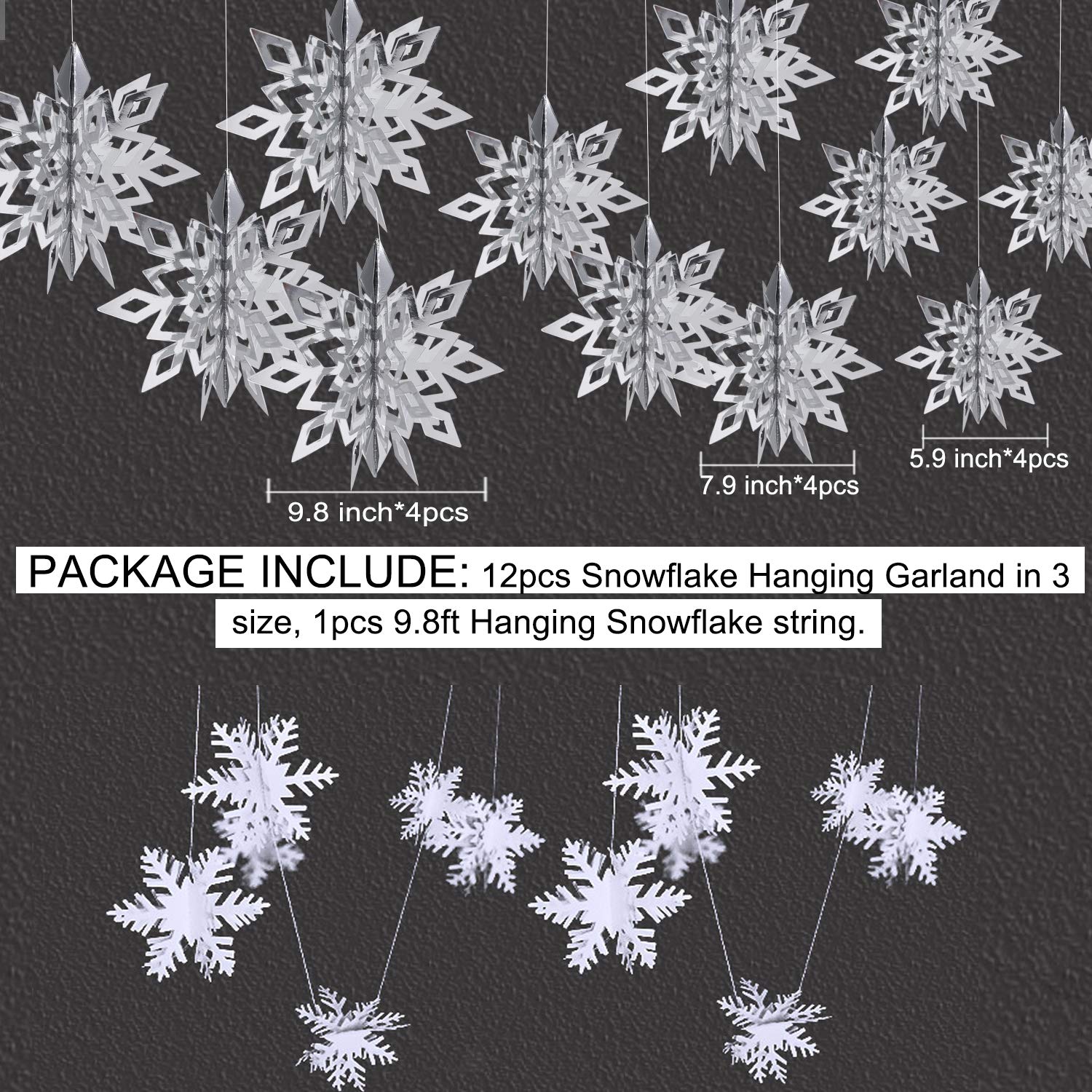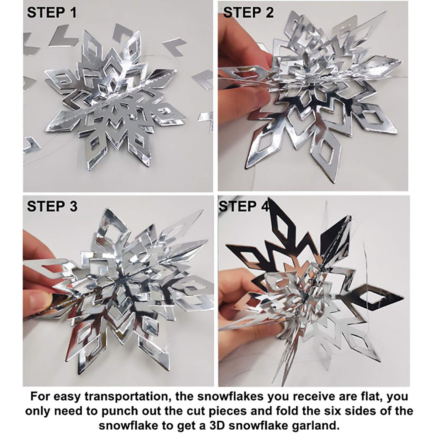 Suitable Size: Large silver snowflake has three sizes 9.8'' / 7.8'/5.9'', 4pcs of each size. The snowflake garland is 9.8 feet long with 12pcs snowflake in three size 4.7“/3.9"/3"