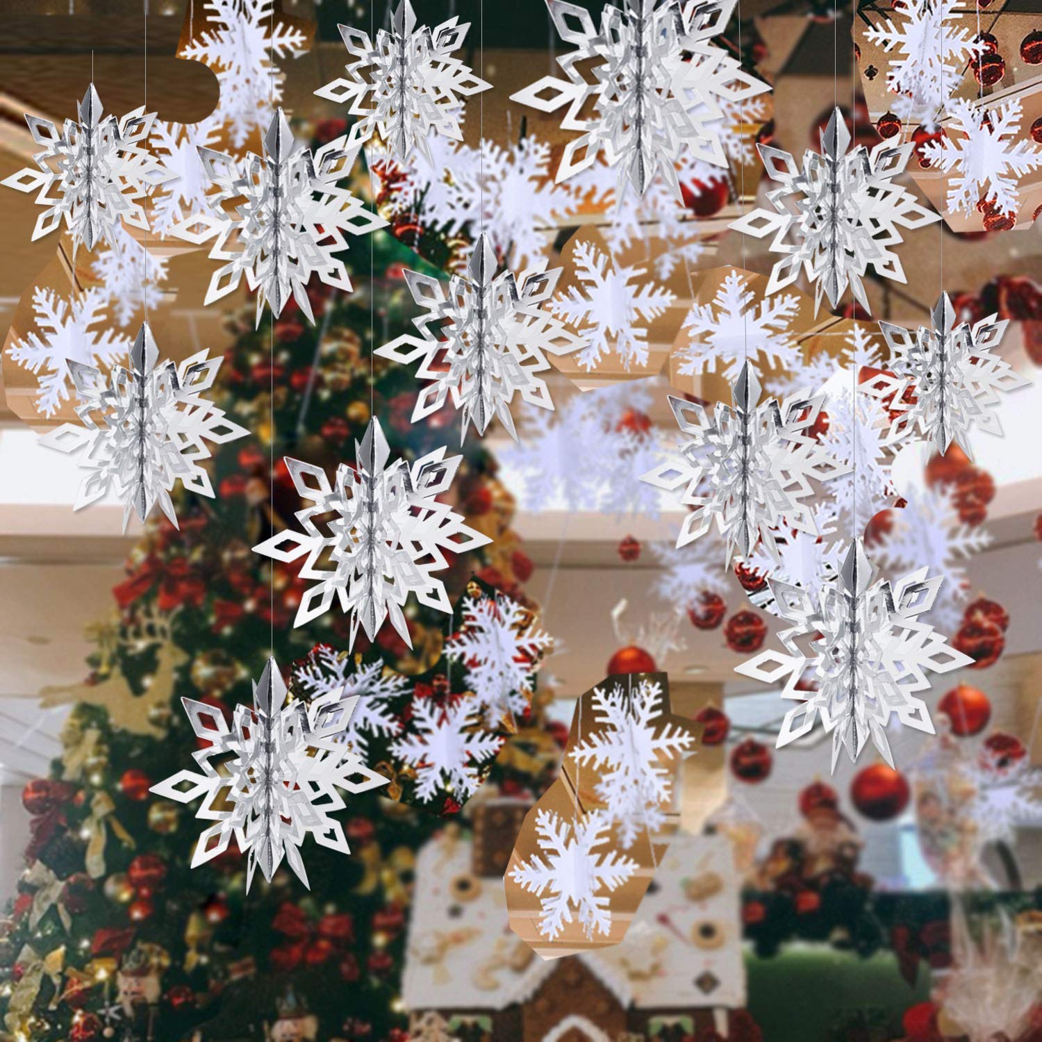 Valuable Pack: 12pcs 3D Glittery Large Silver Hanging Snowflake & 12 pieces 3D snowflakes in one string. Just fold along the sewing seam to get 3D snowflakes!