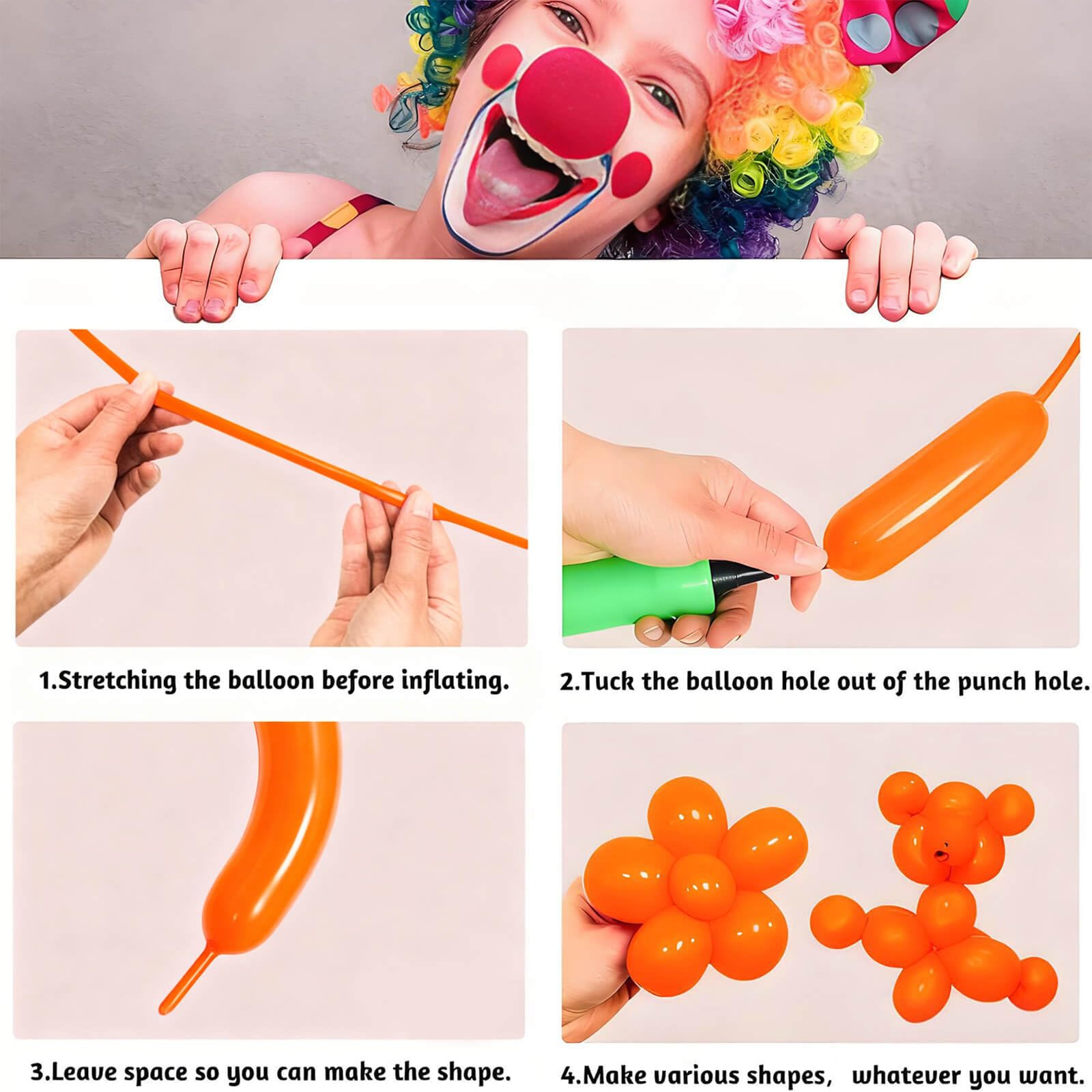 THE PACKAGE INCLUDES: 100 long balloons for balloon animals,can be shaped into any interesting sculpture or animal for professional balloon twisters and artists.