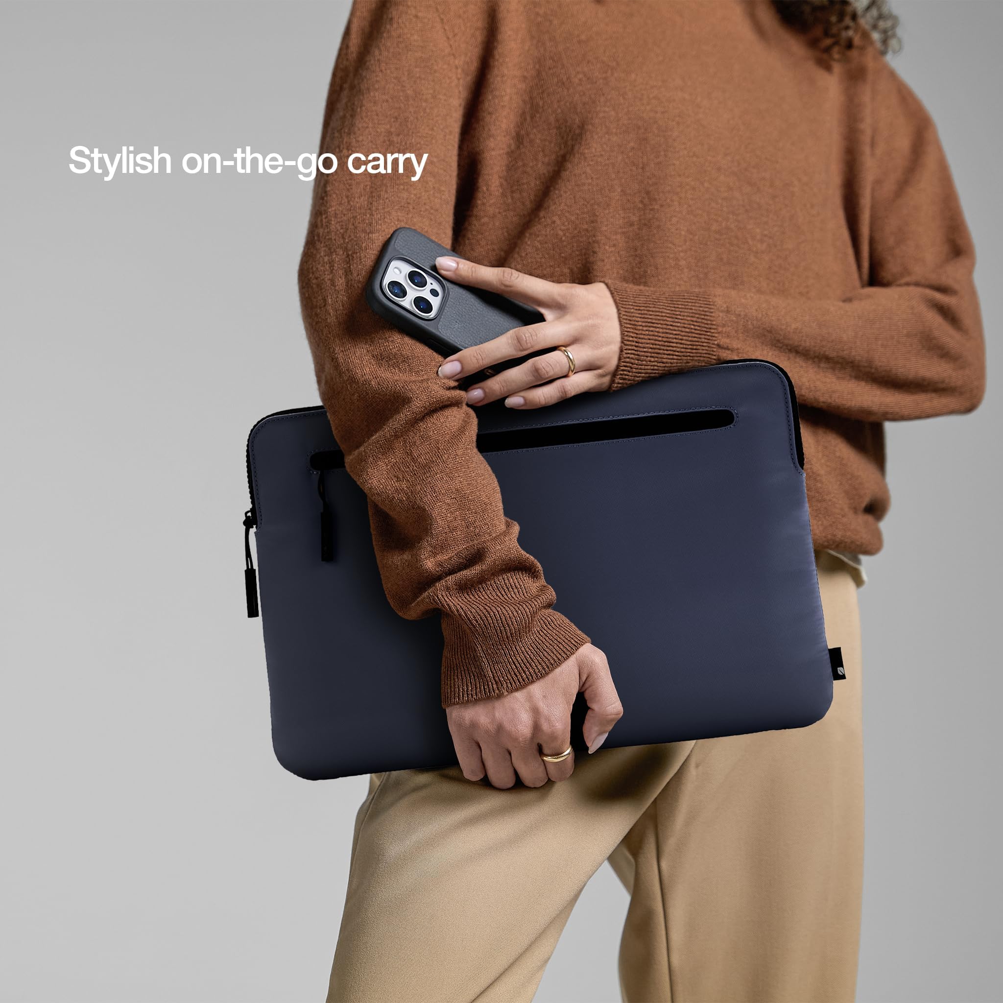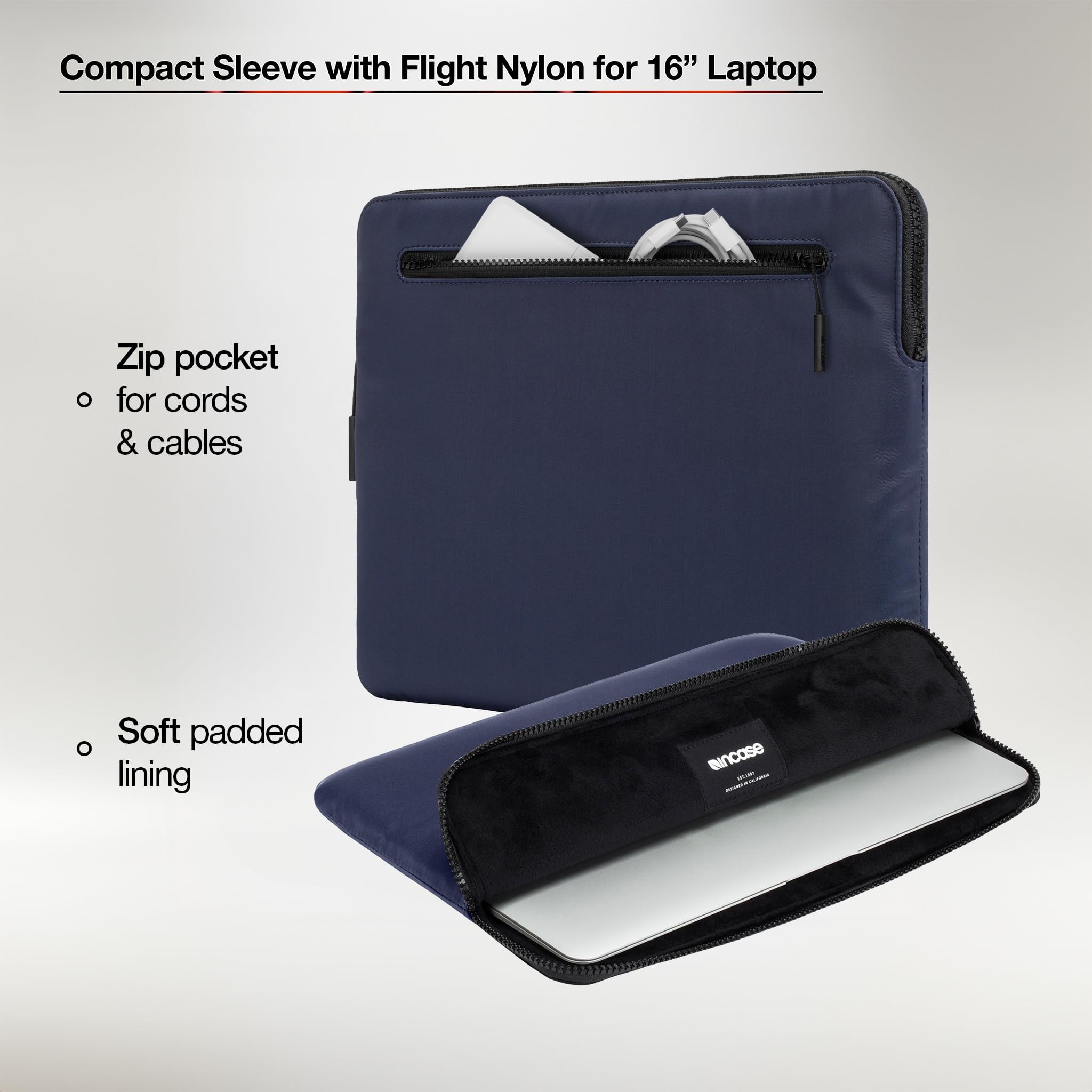 Protect your device in style with the Incase Compact Sleeve 16", designed for those who value premium protection and sleek design. Compatible with MacBook Air, MacBook Pro, iPad, and most 16-inch laptops including Lenovo, this laptop sleeve is available in two refined material options: Flight Nylon, a smooth, lightweight fabric known for its close weave and durability, and Woolenex, a dual-weave polyester that resists moisture, chemicals, and abrasion. The interior is lined with plush faux fur that cushions your device and prevents scratches, while the streamlined silhouette slips easily into any backpack, laptop bag, or tote. A front panel zippered pocket offers space for your essential laptop accessories like chargers, cables, or earbuds. Finished with custom metal zipper pulls, this 16 inch laptop cover blends style and functionality to keep your device protected wherever you go. Whether you're commuting, working remotely, or heading to class, the Incase Compact Sleeve is the ideal choice for anyone looking for a reliable, stylish MacBook case, laptop sleeve, or computer case. The Compact Sleeve with Flight Nylon is designed to fit all 16" models from 2016–2024, including the latest MacBook Pro and MacBook Air, and is a smart addition to your collection of laptop accessories. The Compact Sleeve with Woolenex is designed to fit models from 2019-2024.