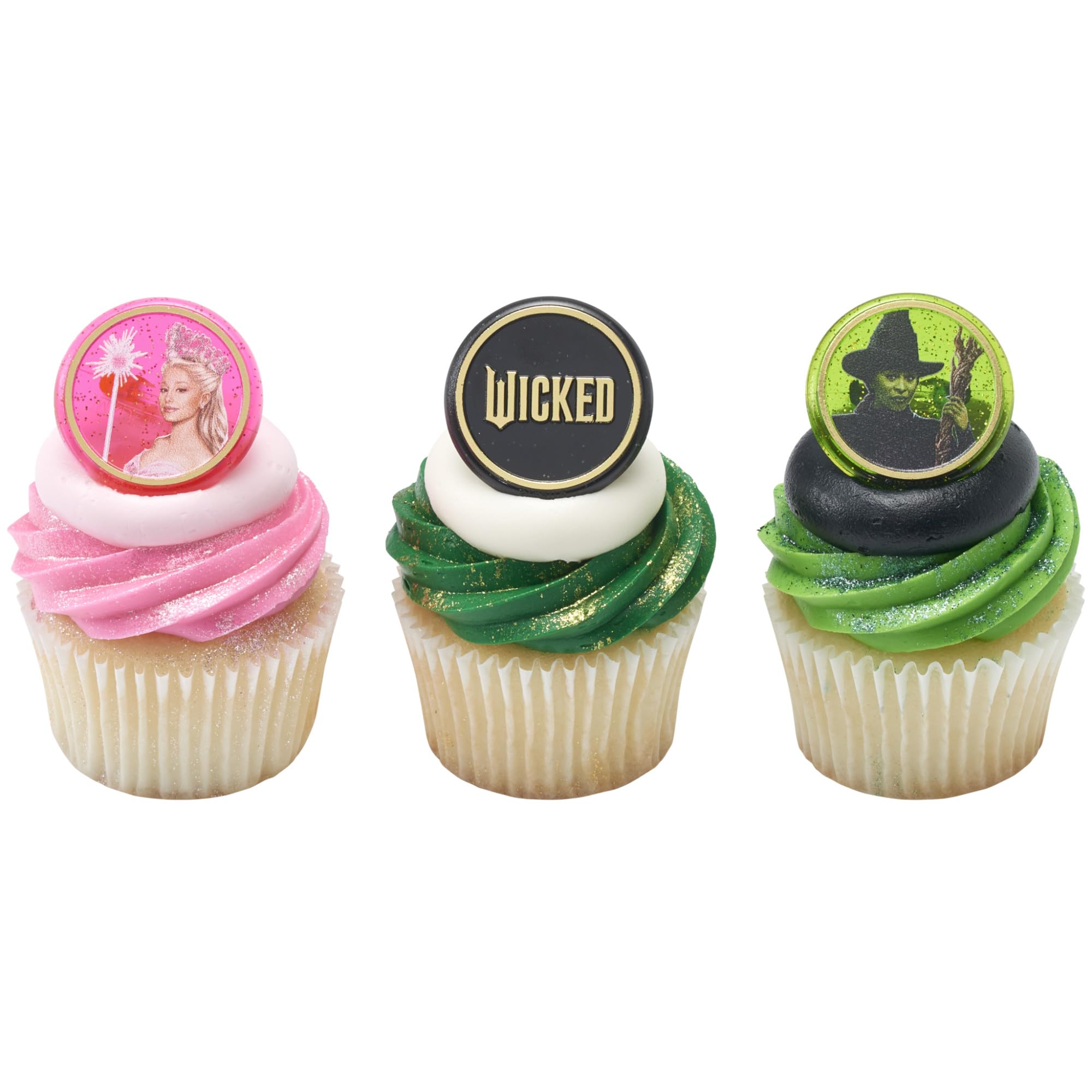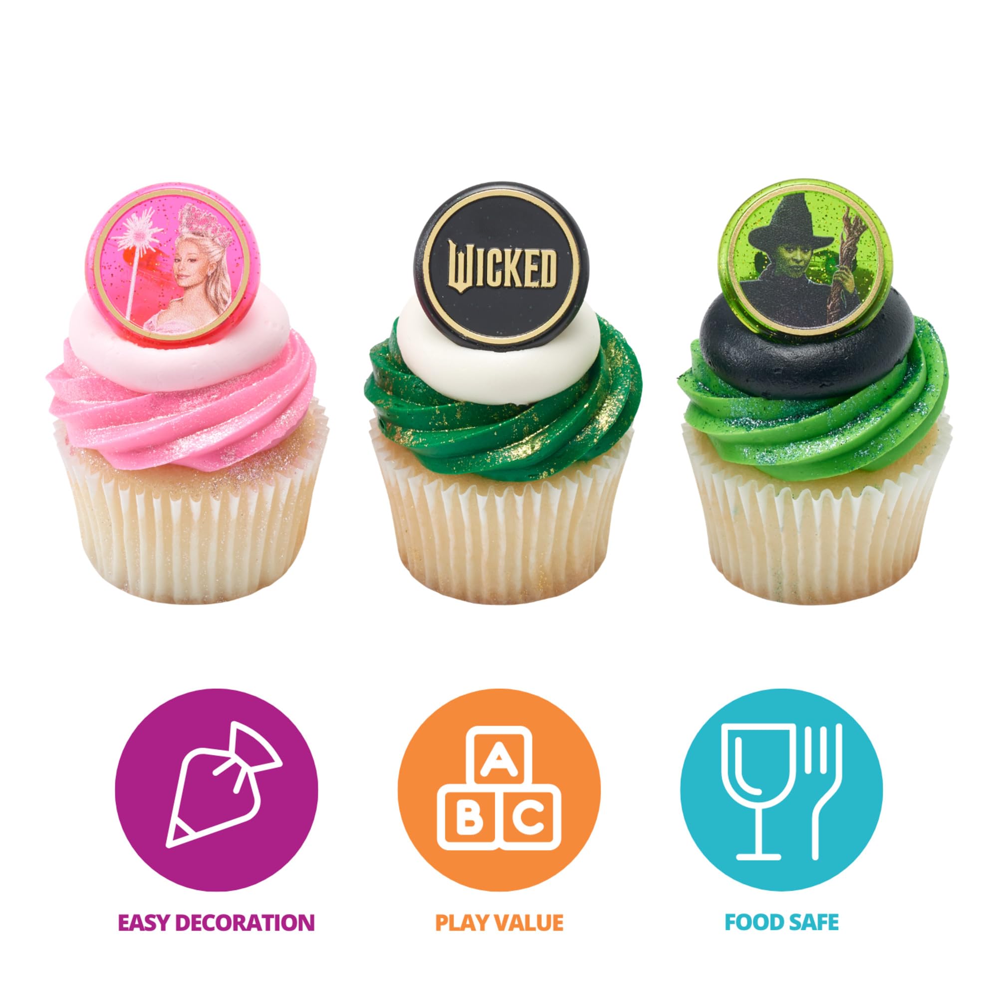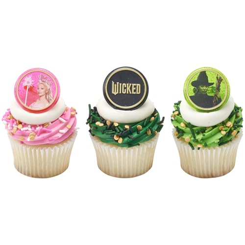 Wicked Cupcake Rings With Glinda And Elphaba, 24 Cupcake Decorations For Cakes, Birthday's, Celebrations, Food Safe Cake Toppers - 24 Pack DecoPac Wicked Cupcake Rings - 24 round Cupcake Rings featuring Glinda and Elphaba, played by Ariana Grande and Cynthia Erivo, from the iconic movie Wicked. The perfect addition for any Wicked themed party. Ideal for birthdays and celebrations these 24 Officially Licensed rings are ready to add to cakes, cupcakes, muffins, donuts, or other baked treats. Perfect for cupcakes or as part of a large celebration cake design! These Green, Pink, and Black glitter rings are sure to create a celebration cupcake showstopper! Made of strong plastic, these long-lasting cake decorating items can be used over and over again and are perfect for any Wicked themed party or birthday. 𝘞𝘪𝘤𝘬𝘦𝘥 Cupcake Rings are made of food-safe molded plastic and will stand steady on the cake or cupcakes. Get your Cake Decorations from the same place as the professionals! This is just one of the many cake toppers and quality products available at DecoPac. Professional cake decorators worldwide rely on DecoPac Inc. for all their cake decorating needs. © Universal City Studios LLC. All Rights Reserved.