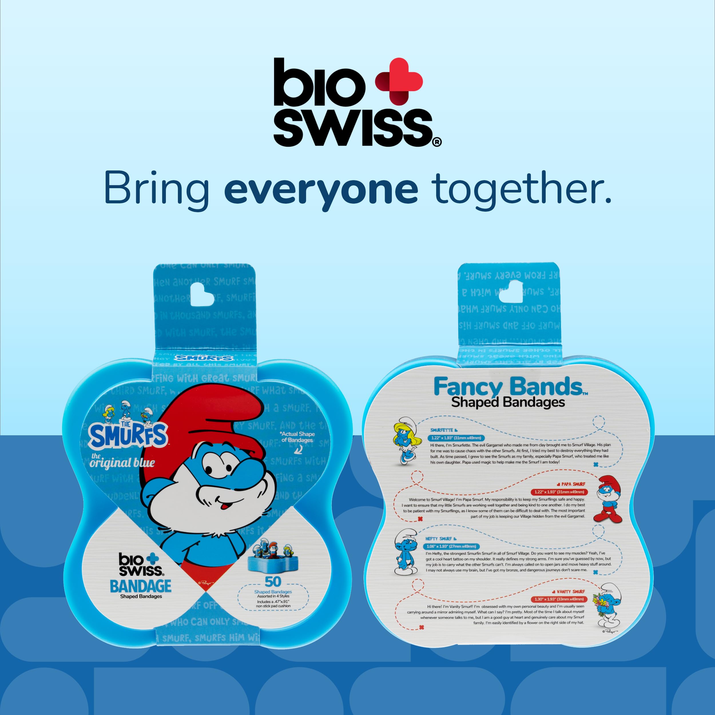 CLASSIC SMURF BANDAGES: This 50 piece plastic case of childhood classic cartoon Smurf shaped bandages is great for putting a smile on kids' faces while protecting wounds such as cuts, scrapes, and burns, and come in a variety of Smurf characters such as Papa Smurf, Smurfette, Hefty Smurf, and Vanity Smurf. These sticky bandages are perfect for kids and adults alike, and also for school nurses and pediatric doctors