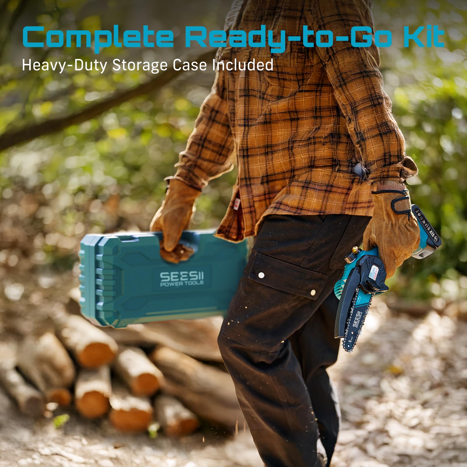 OTHERS GIVE YOU CARDBOARD BOXES, SEESII GIVES YOU ARMOR: plastic boxes are easier to carry and store than cardboard boxes, protecting your chainsaw and making it easy to organize accessories. The package includes everything you need: 2 batteries, 1 suitcase, 2 chains (one pre-installed), 1 oil bottle(oil not included), 1 pair of gloves, 1 charger, and 1 screwdriver. With these essentials, you can start working right away without any extra cost or wasted time.