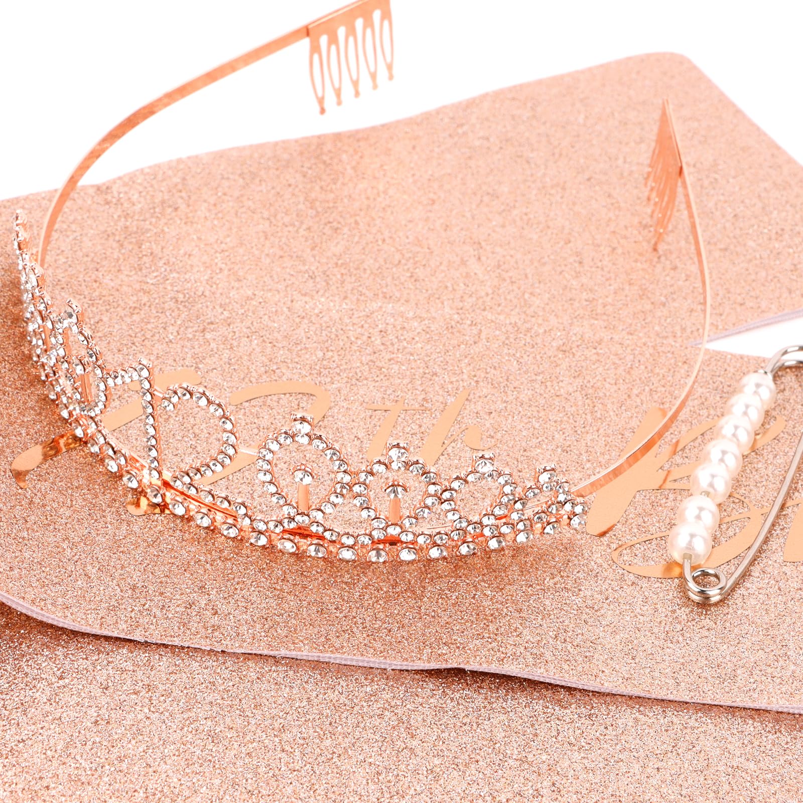 One Size Fit All - Birthday sash - Length: 61” (155cm), Width: 3.7” (9.5cm); Rhinestone Tiara are adjustable as well comes with comb design that can holds and stable and comfortable on top of the hair. Birthday sash can be fixed and adjusted in length with pearl pins .