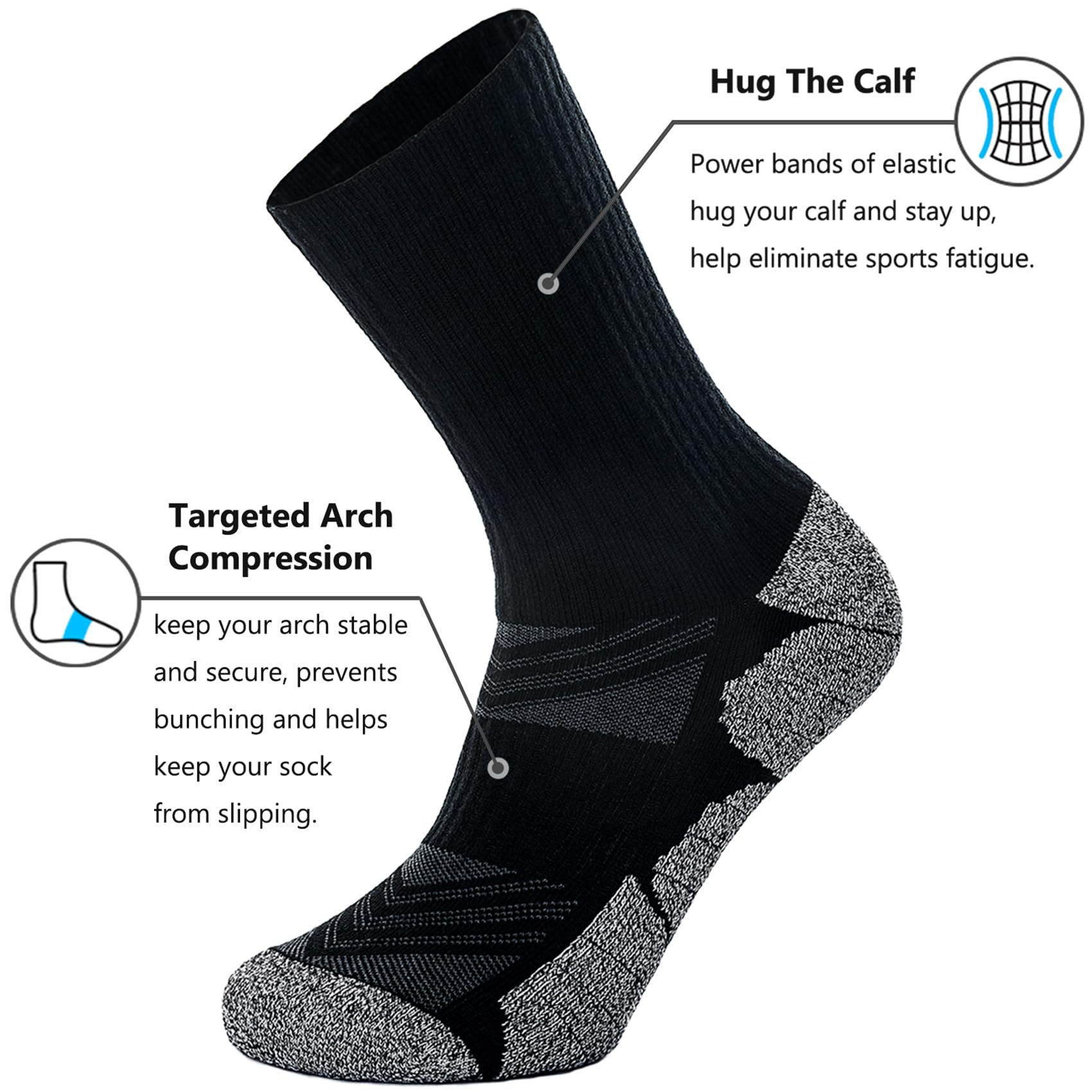 PERFORMANCE FIT: No slipping, no bunching, and no blisters. Socks are designed with med-compressed and elasticity to gently support and protect the arches, ankles, heels, and stay up, holds the sock securely on the calf