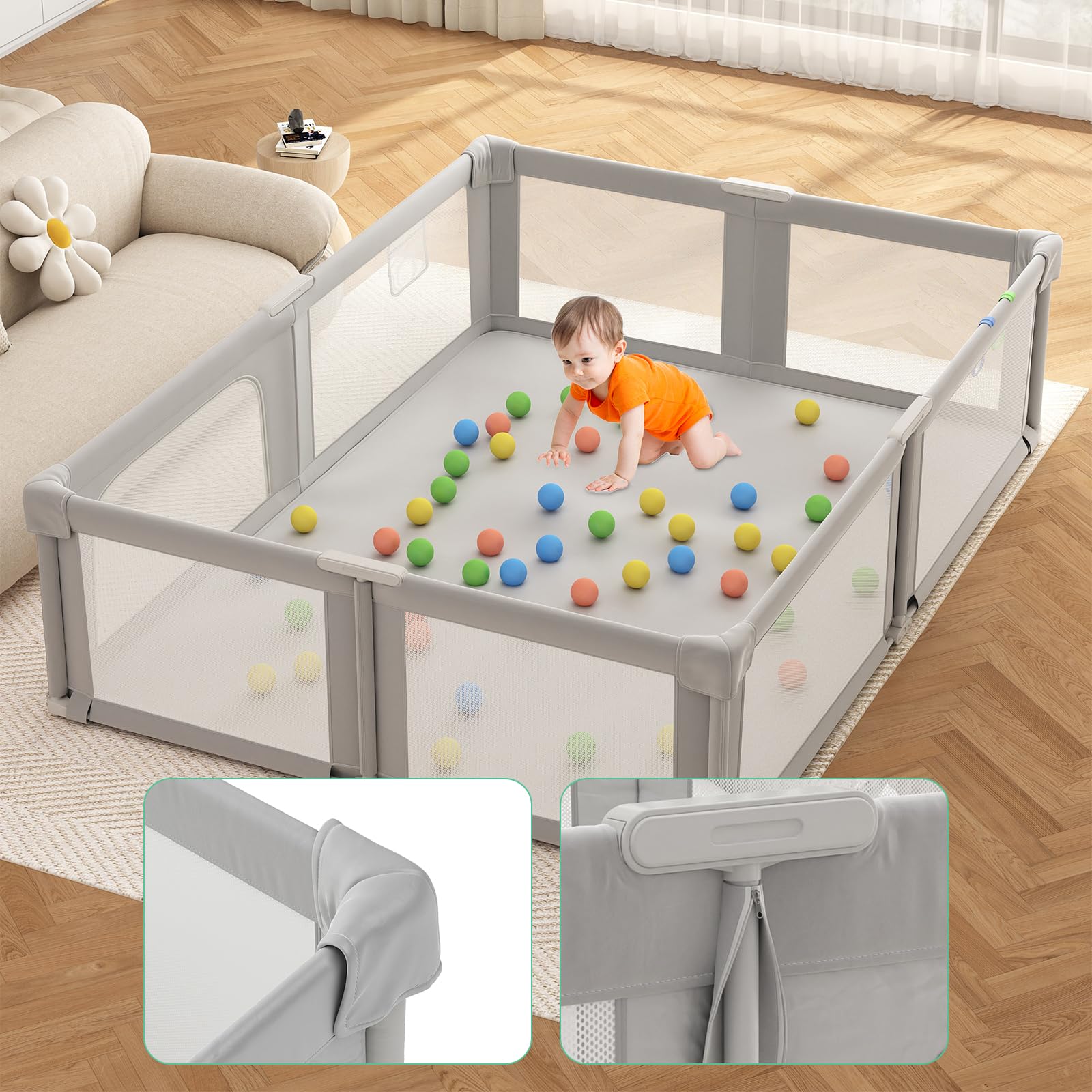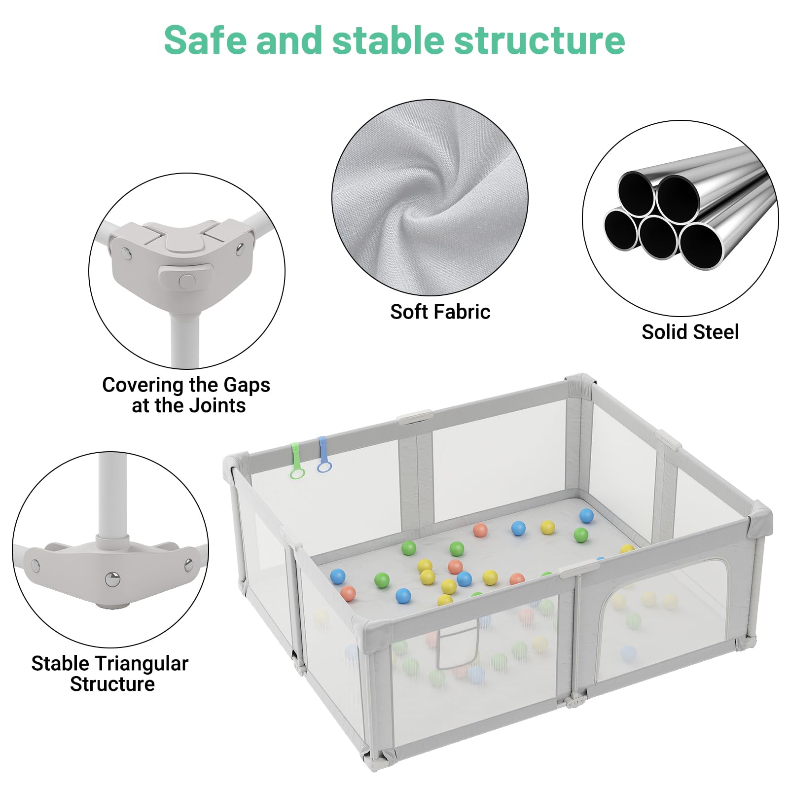 Stable, Safety and Eco-Friendly:This large toddler playpen features triangular connections for a sturdy, stable structure, with an anti-slip base to prevent tipping and ensure safety. Made from eco-friendly, odorless materials, it's safe for your baby's skin. Rounded edges protect your child from harm, providing a secure and comfortable play environment for parents’ peace of mind