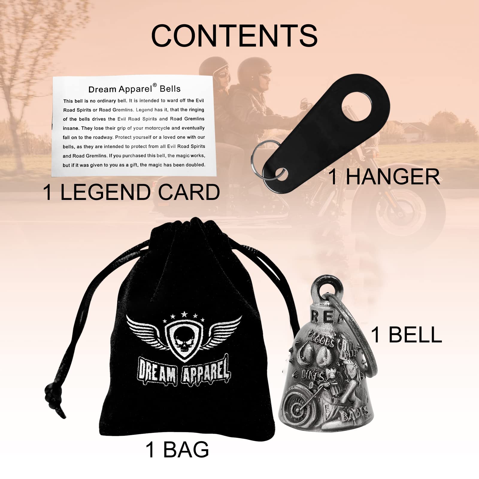 [Size] The motorcycle bell is 1.18 inch in diameter, 1.77 inch in height, and the clasp is 1.18 inch in diameter. The weight of the bell is 0.18 lb. You‘ll receive a motorcycle bell, a black hanger, a motorcycle bell legend note card, and a 2.75" x 3.62" velvet drawstring black bag. Various exquisite patterns are available according to your personal preferences.