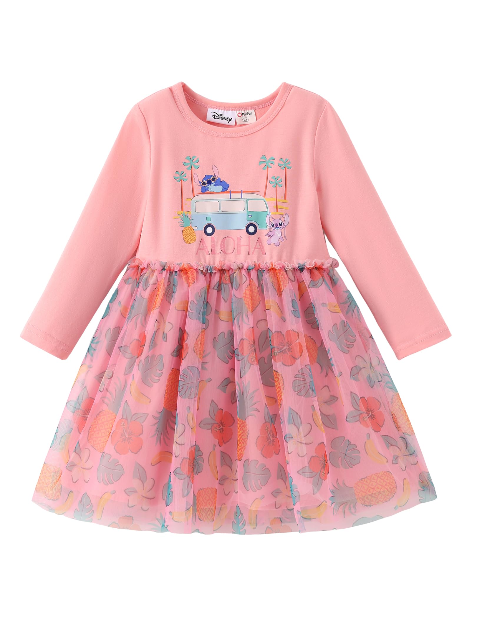 Stitch Dress for Girls: This charming dress features a fun "Aloha" graphic with Stitch and a tropical van, paired with a colorful tulle skirt featuring a playful pineapple and palm leaf print. The soft long-sleeve bodice and flowy skirt make it perfect for casual days, beach trips, or any sunny occasion