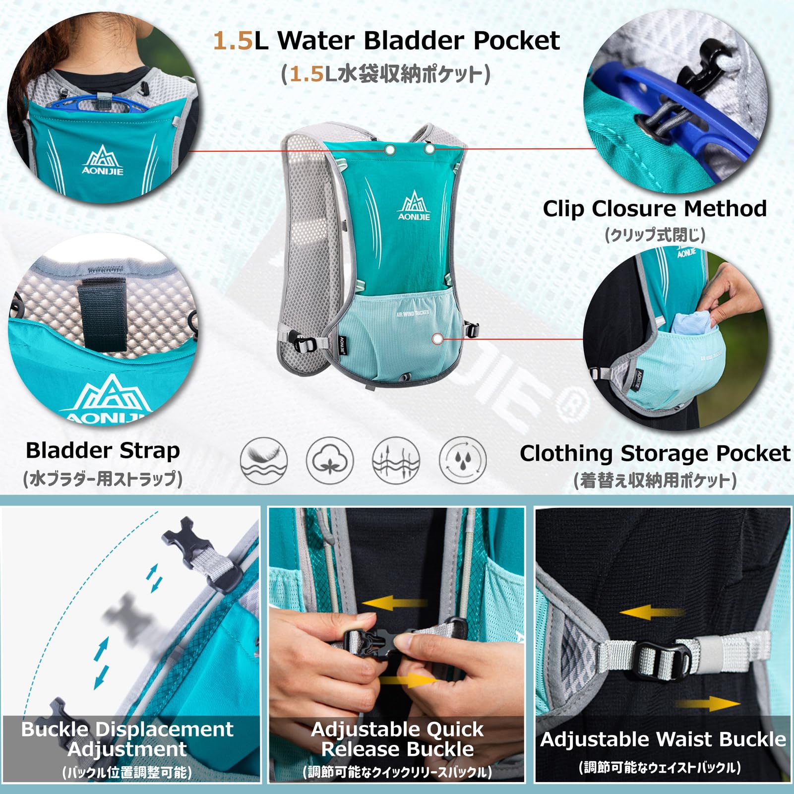 Breathable & ultra-light: The hydrated backpack is made from lightweight, breathable mesh and high-quality nylon fabric, that's very lightweigh and comfortable and durable. Soft and lightweight mesh on the back and shoulder straps for maximum breathability