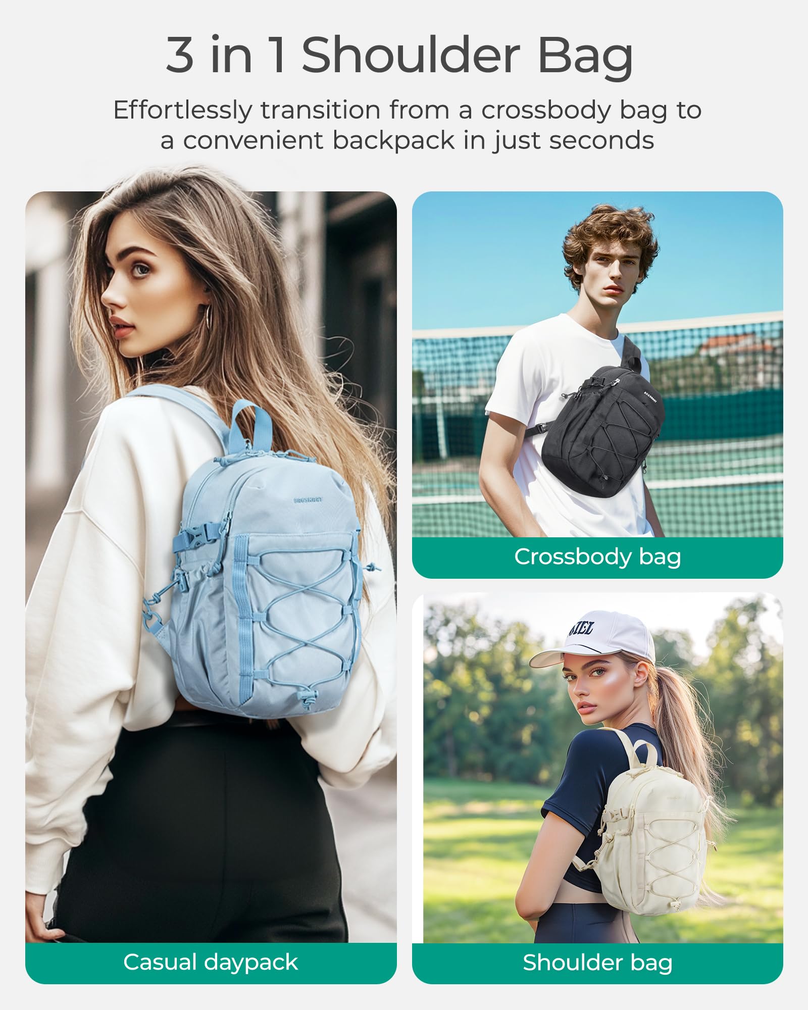 Versatile Carrying Options: This bag adapts to your lifestyle with its three-in-one design, allowing you to wear it as a small backpack, shoulder bag, or crossbody bag. The detachable hooks on both sides make it easy to switch between styles, providing hands-free convenience and comfort for any activity, whether you're commuting, traveling, or enjoying a casual day out.Size: 12.2'' x 7.4'' x 4.9'', Lightweight: 0.9 lbs