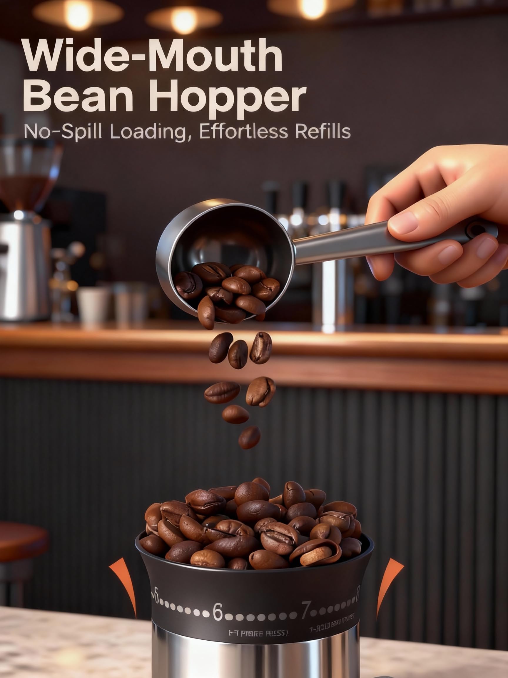Advanced Ceramic Burr – Durable, Cool & Flavor-Preserving:Equipped with a high-strength ceramic grinding core that stays cooler than stainless steel burrs, prevents overheating, and extends durability. Delivers consistent grounds while protecting delicate coffee aromas