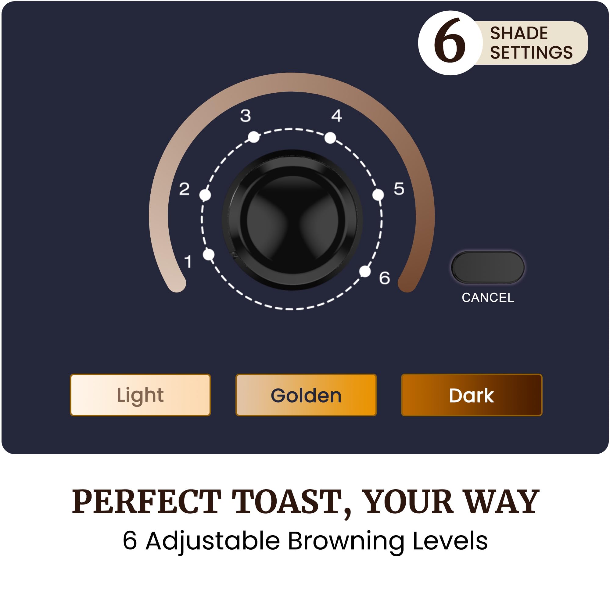 EVEN, CUSTOMIZABLE BROWNING: 6 adjustable shade settings let you toast from lightly golden to crispy dark. Self-centering guides help position bread for more consistent heat distribution. Start on level 2–3 for first use and adjust to your preference.