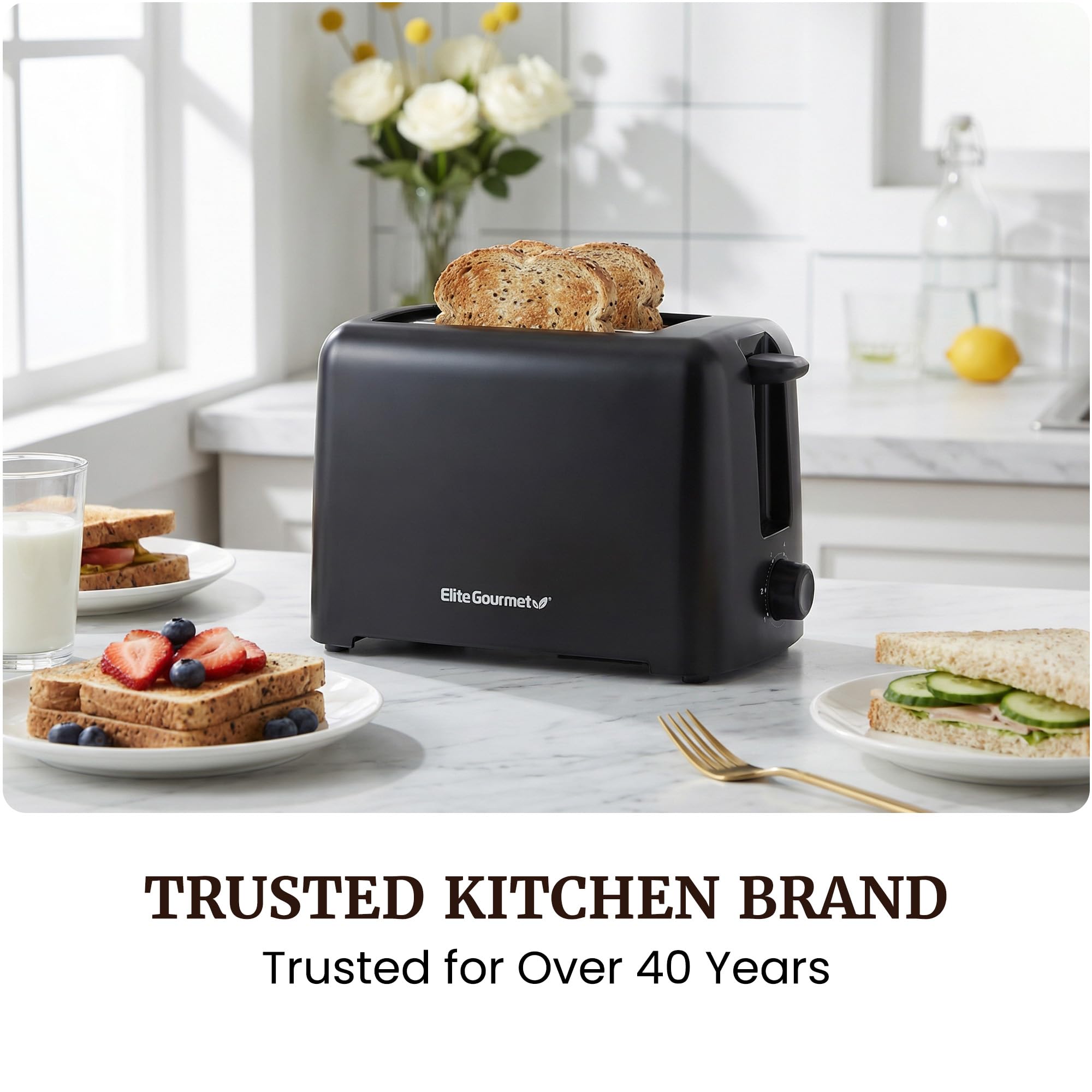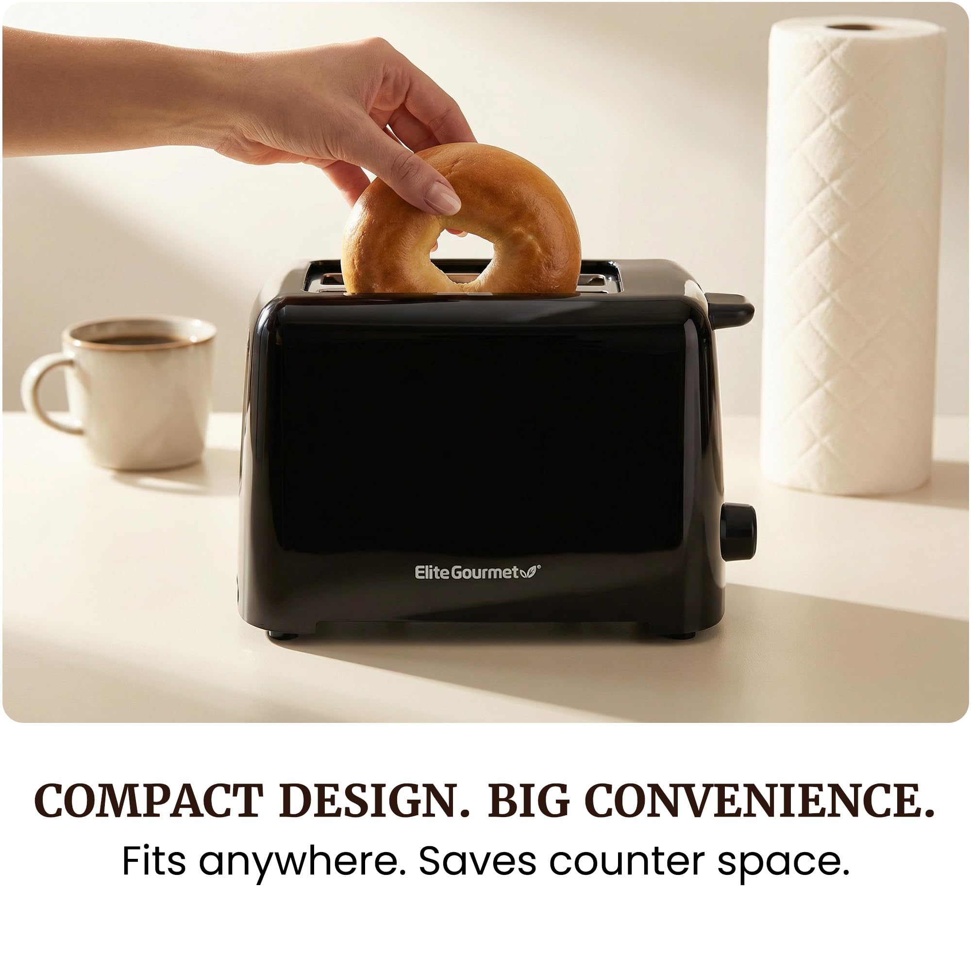 Start every morning with toast exactly how you like it. The Elite Gourmet 2-Slice Cool Touch Toaster combines compact design, customizable browning control, and everyday convenience in one affordable kitchen essential. With 6 adjustable shade settings and automatic self-centering guides, you’re in control of every slice — from lightly golden to crispy dark. The extra wide 1.25” slots easily accommodate bagels, waffles, English muffins, and thick-cut breads. Designed with safety and simplicity in mind, this toaster features a cool-touch exterior, cancel function, non-slip feet, and a slide-out crumb tray for easy cleaning. ETL certified for safe countertop use, it’s ideal for apartments, dorms, offices, and RV kitchens. For over 40 years, Elite Gourmet has delivered stylish, user-friendly kitchen products backed by responsive US-based support — making everyday cooking simple and reliable.