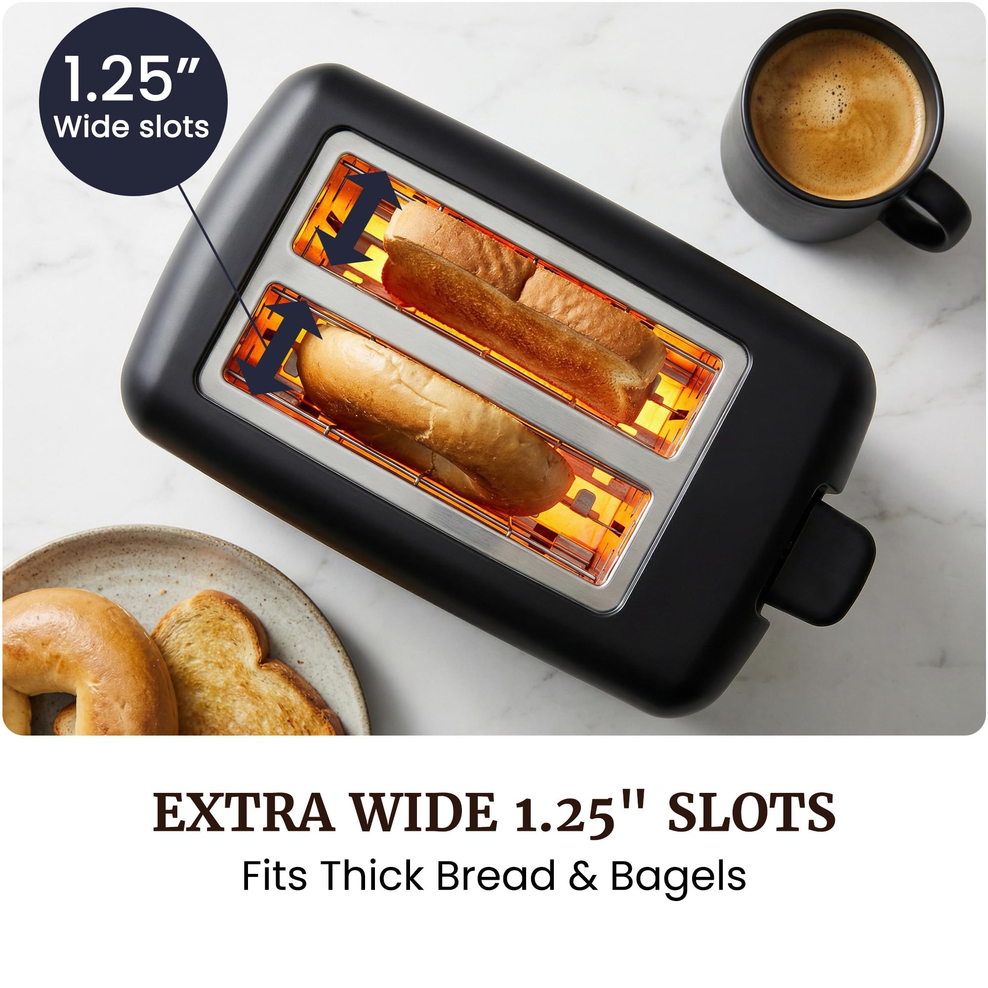 XTRA WIDE 1.25” SLOTS: Easily fits bagels, waffles, English muffins, and thick-cut specialty breads without jamming or uneven edges.