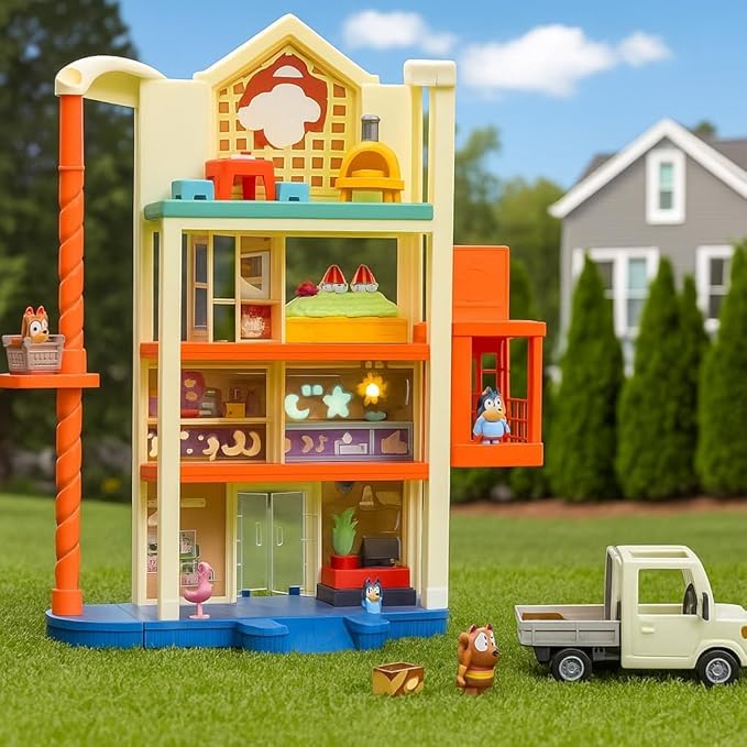 Interactive Design: Explore 4 exciting levels and 9 play areas in our 22β Bluey kids playset; press the Paw Button to trigger 45+ lights and sounds, ride the lift, and send the play shopping cart spinning down the return for engaging pretend play.