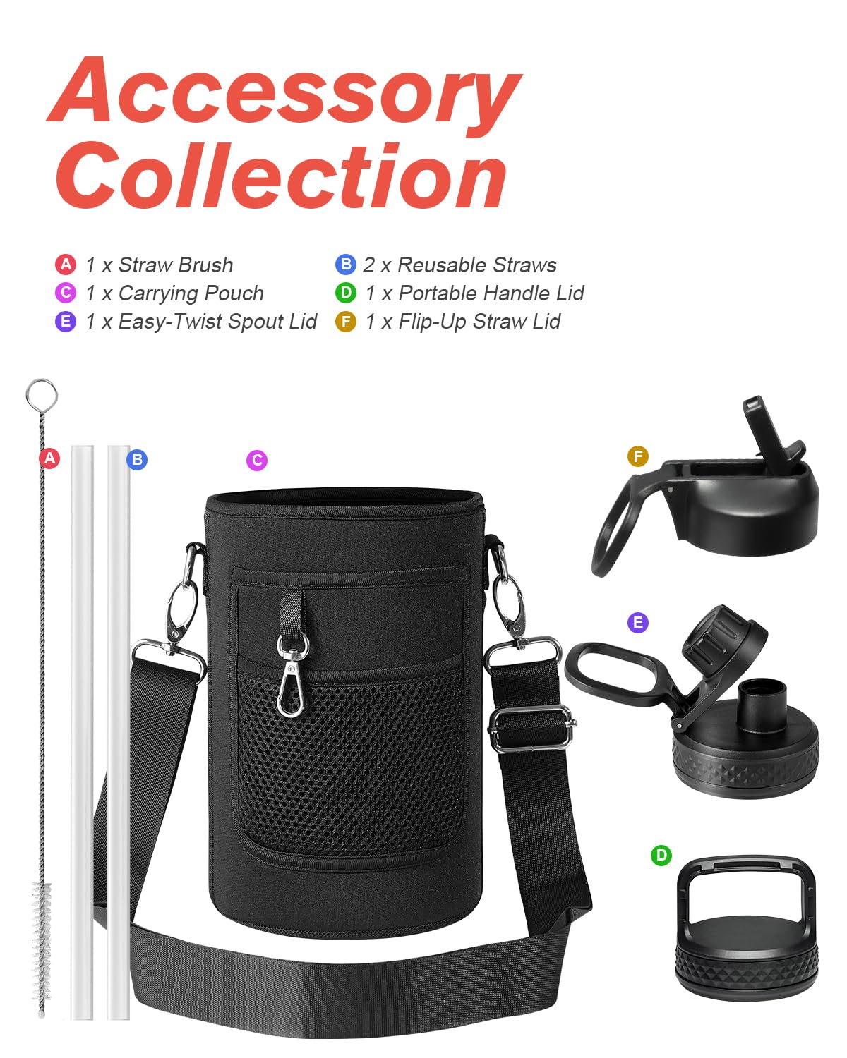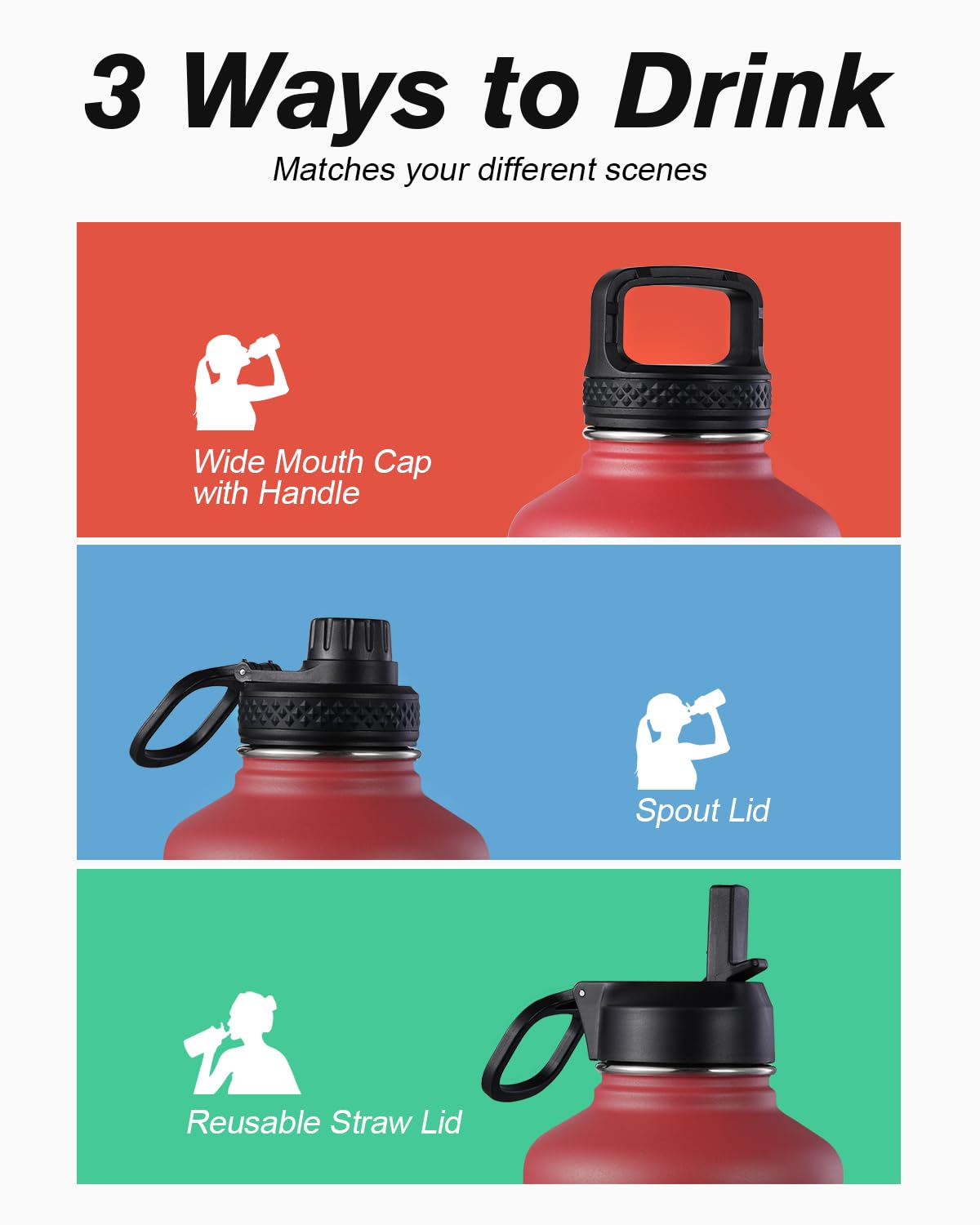 Flexible Drinking On-the-Go: This water jug comes with 3 different lids. The screw-on lid with flip-up handle is for easy ice refilling with superior portability; spout lid makes it convenient to drink hot liquid and straw lid for sipping cold