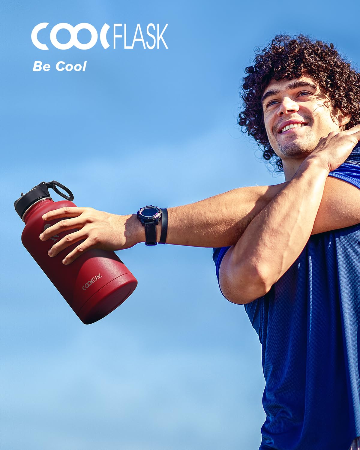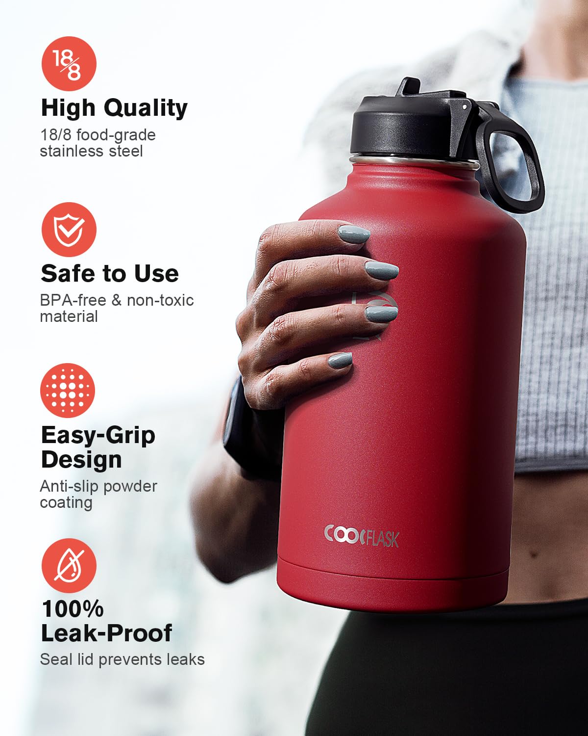 Coolflask Half Gallon Water Bottle Insulated with Straw & 3 Lids, 64 oz Water Jug Large Metal Stainless Steel Wide Mouth for Sports, Gym or Office, Non-BPA Keep Cold 48H Hot 24H, Red
