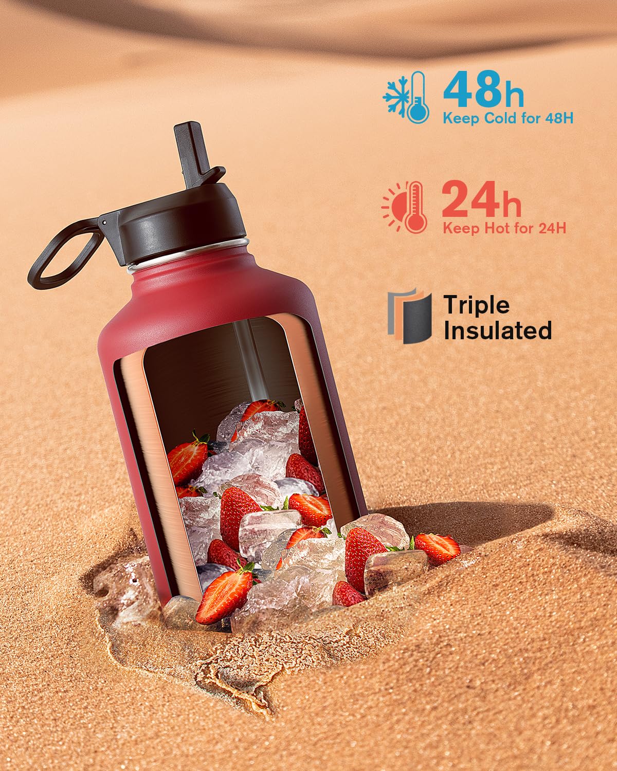 48H Cold & 24H Hot: Triple Insulation Technology adopts double wall and vacuum seal, keeps beverages cold for up to 48 hours and hot 24 hours. Anti-sweat coating can keep the surface dry and clean, making it easy to grip