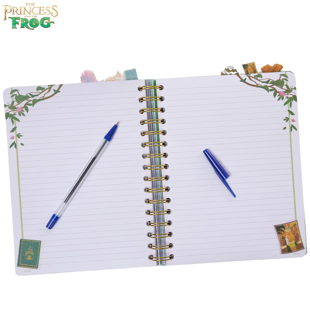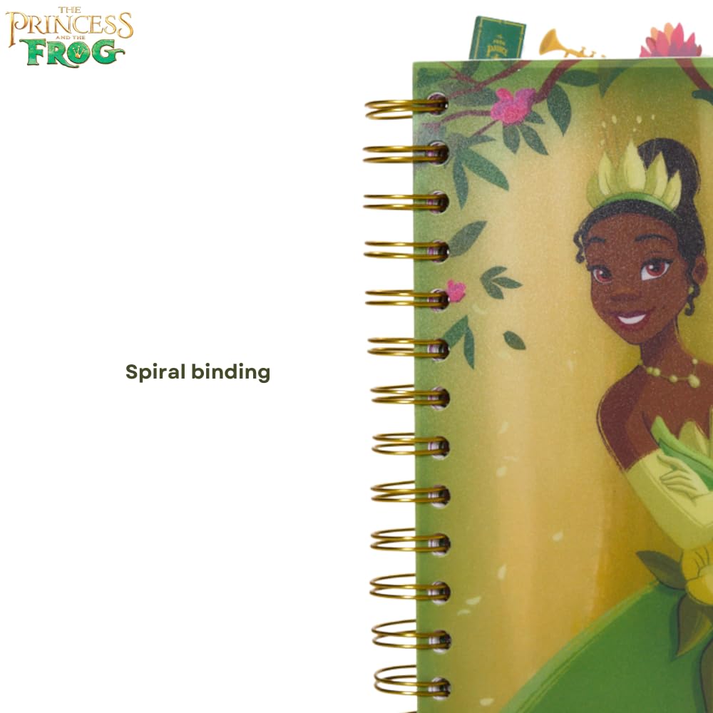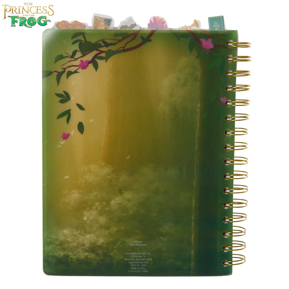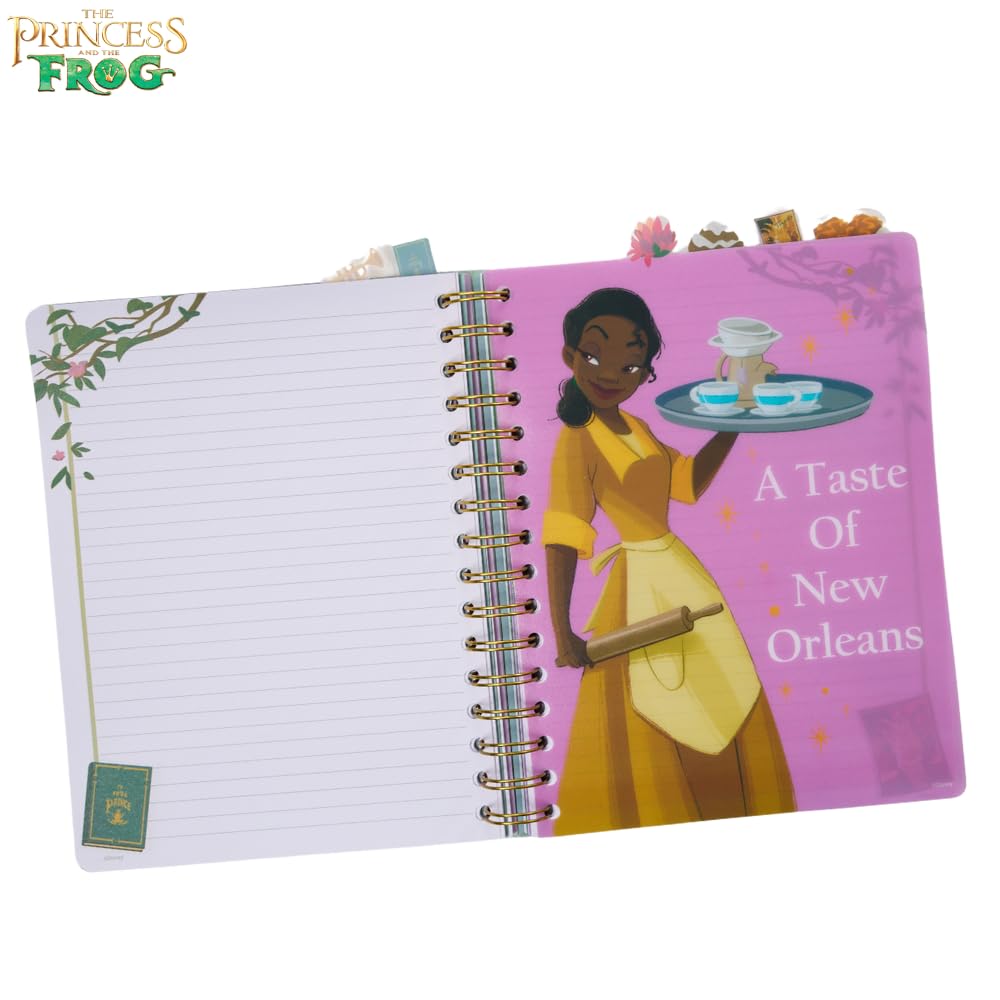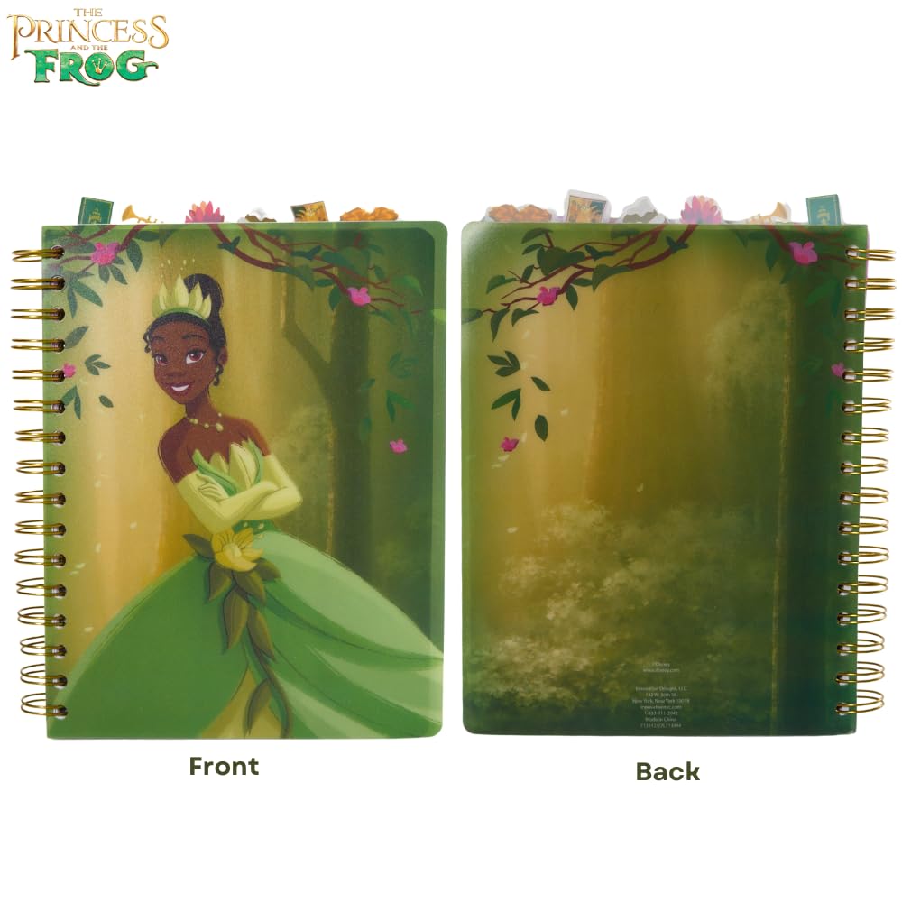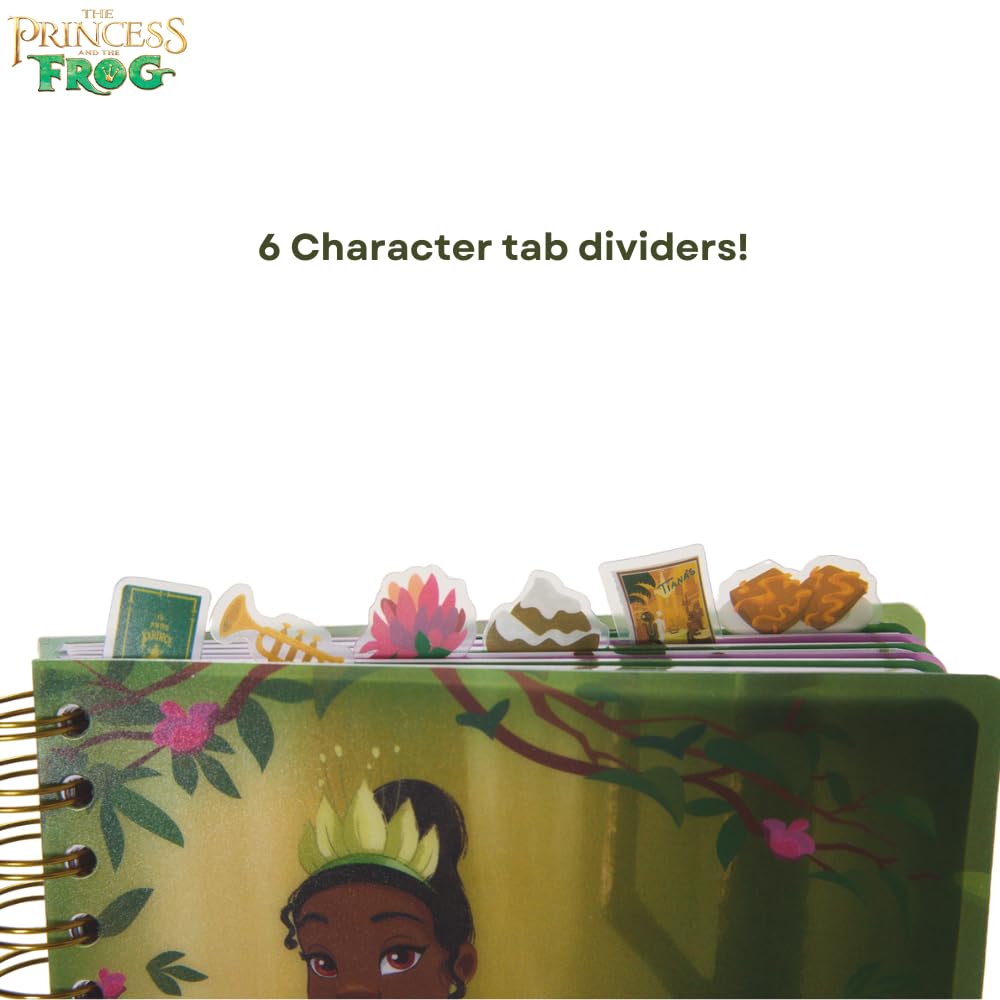 The Disney Princess and the Frog Tab Journal Notebook is a must-have for any fan of the iconic Disney movie. Featuring a vibrant cover with Princess Tiana, this spiral-bound notebook includes 144 lined pages, each adorned with colorful movie graphics on the corners. Inside, you'll find six section dividers, each showcasing beautiful illustrations of characters from The Princess and the Frog, making it a fun and functional way to organize your thoughts. The durable vinyl cover is easy to clean, while the tab dividers with princess icons ensure easy access to each section. Measuring 8x7 inches, this notebook is perfect for writing, journaling, or planning, whether at home, school, or on the go. A great gift for Disney fans of all ages, this journal combines practicality with enchanting design.