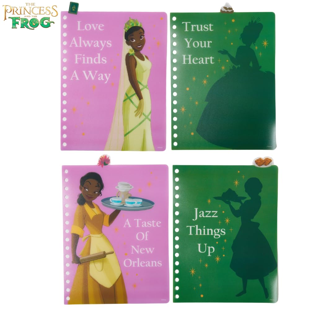 DISNEY NOTEBOOK - Features a cover with Disney princess Tiana! Along with lined pages with color images of movie graphics on the corners, 6 color section dividers, and tab dividers.