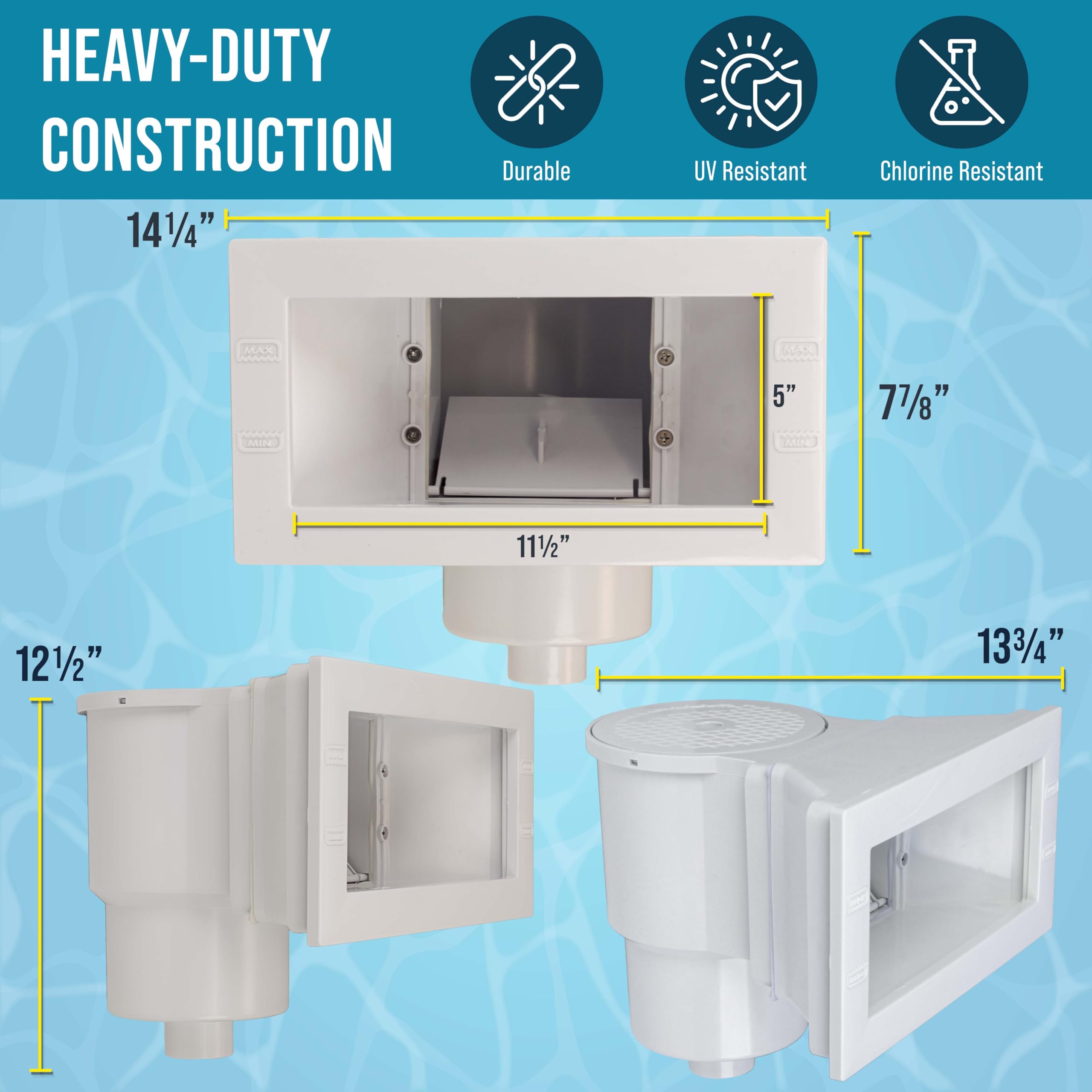 Heavy-Duty Construction: Wide mouth size thru-wall skimmer constructed from high-impact, UV-resistant ABS plastic; engineered to withstand harsh outdoor weather conditions, pool chemicals, and sunlight without cracking or fading over time.